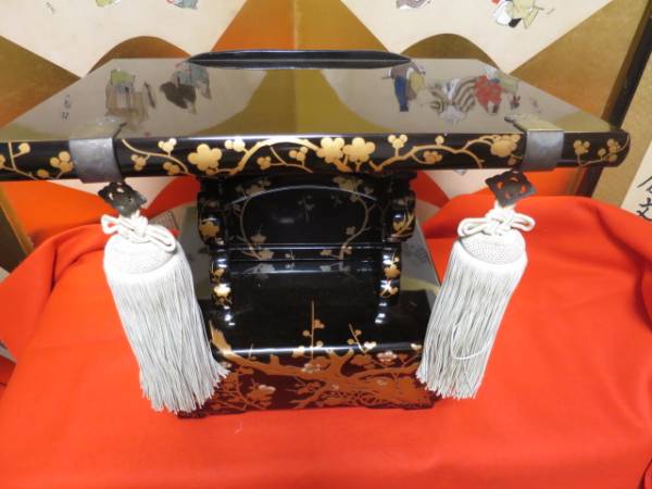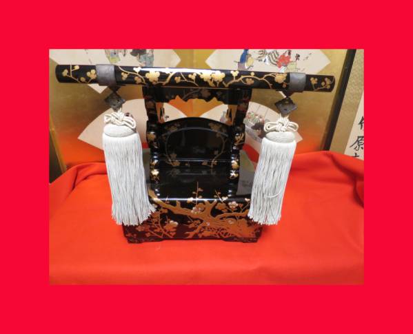 「蒔絵見台O-567」 梅花の蒔絵で珍しく家紋が入っていませんので貴方様の家紋を 入れること可能です。 巾50.5cm高さ48cm奥行き34cm 大変状態のいいものです。 |