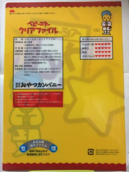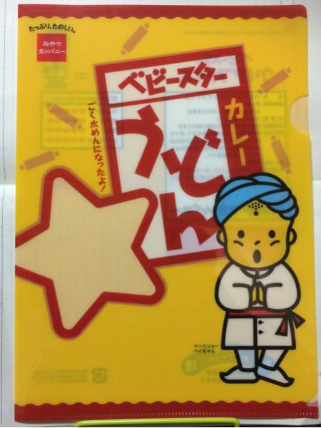 おやつカンパニー ベビースターカレーうどんのマハラジャ・ベイちゃんの描かれたクリアファイルです。