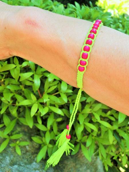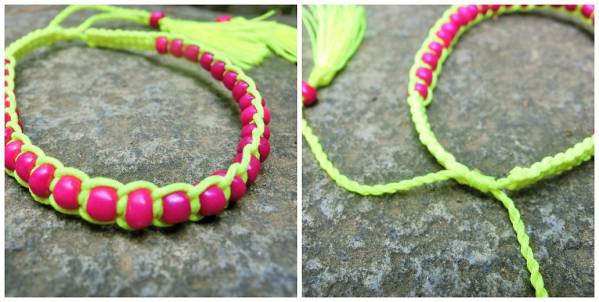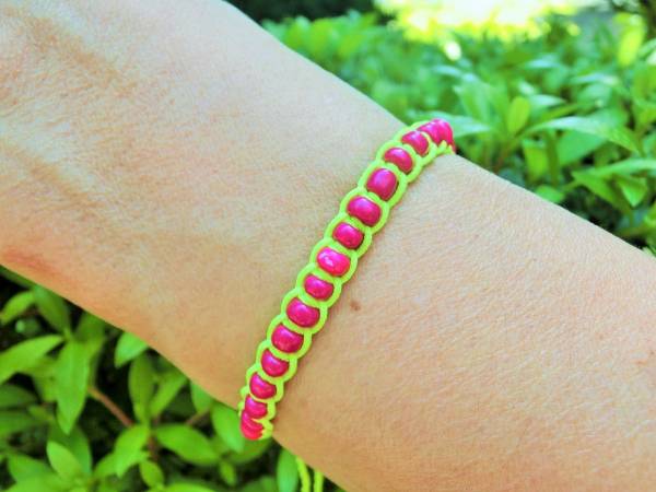 ネオンカラーの紐編み&ビーズのかわいいブレスレットです
