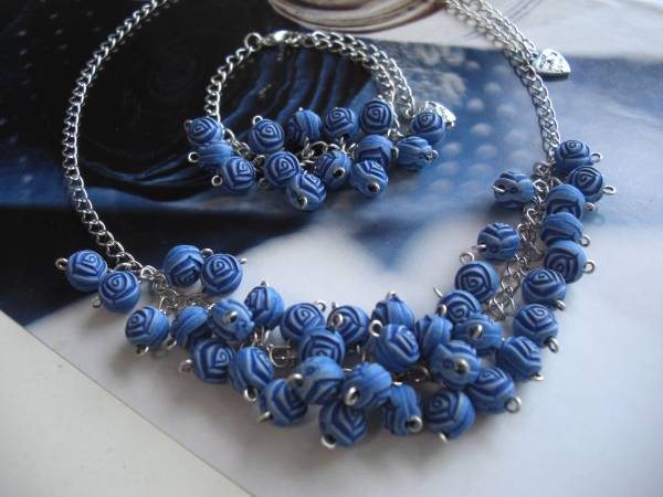 ロマンチックを紡いで・・シリーズです♪蒼い薔薇・・シックな蒼い樹脂薔薇のネックレスとブレスレットの2点セットです♪ダークブルーの小さな薔薇を集めて可憐な表情です♪樹脂薔薇は8ミリ位です♪ネックレスの長さは全長62センチ位で調節自由です♪チョーカー風に着けられても素敵です♪ブレスレットは全長22センチ位で調節自由です♪それぞれ単品でも出品しています♪お揃いのピアスも出品しています♪シンプルでいつまでも着けられるデザインを考えて作りました!ハンドメイドをご理解 頂いてノークレーム、ノーリターンでお願いします