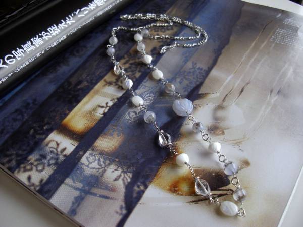 初夏の色を集めて・・シリーズです♪水色のアリス・・可憐な水色のブルーカルセドニーのネックレス2点セットです♪丸玉やタンブルや薔薇のブルーカルセドニーに水晶やムーンストーンなど神秘的な石を合わせてロマンチックな表情です!15ミリ位の薔薇のブルーカルセドニーには10×14ミリのラフカットの水晶や10×8ミリのムーンストーンやアンティークビーズを合わせました♪長さは全長88センチ位で調節自由です♪18ミリ×13ミリのラフタンブルのブルーカルセドニーにはシックな座金やデザインチェーンを合わせました♪長さは92センチ+アジャスター10センチで最長102センチ位です♪それぞれ単品やブレスレットも出品しています♪シンプルで長く着 けていただけるデザインを考えて作りました!ハンドメイドをご理解頂いてノークレーム、ノーリターンでお願いしま す