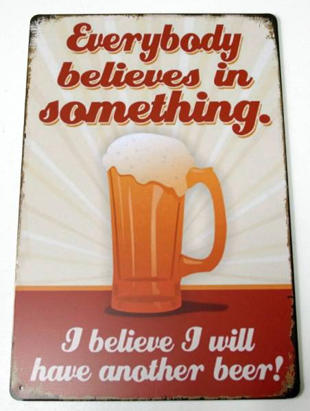 【ブリキ看板】Everybody believes in something.I believe I will have another beer!★ガレージ★アメリカン雑貨/AA-567