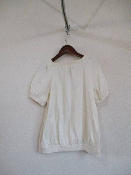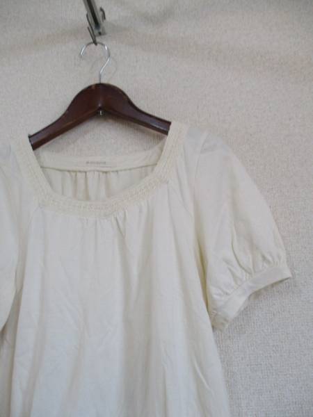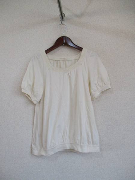 | 商品紹介 | パフスリーブとギャザーでふんわりとした形の半袖カットソーです。 襟周りのレースがポイントになっています。 色はクリームがかった白(キナリ)です。 《素材》 綿100% |
