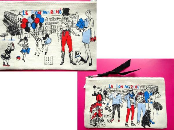 パリ デパート ボンマルシェ 限定 ポーチ 小物入れ 犬 新品 LE BON MARCHE コットン 建物 ユニセックス 生成り 丈夫 ベルエポック リボン