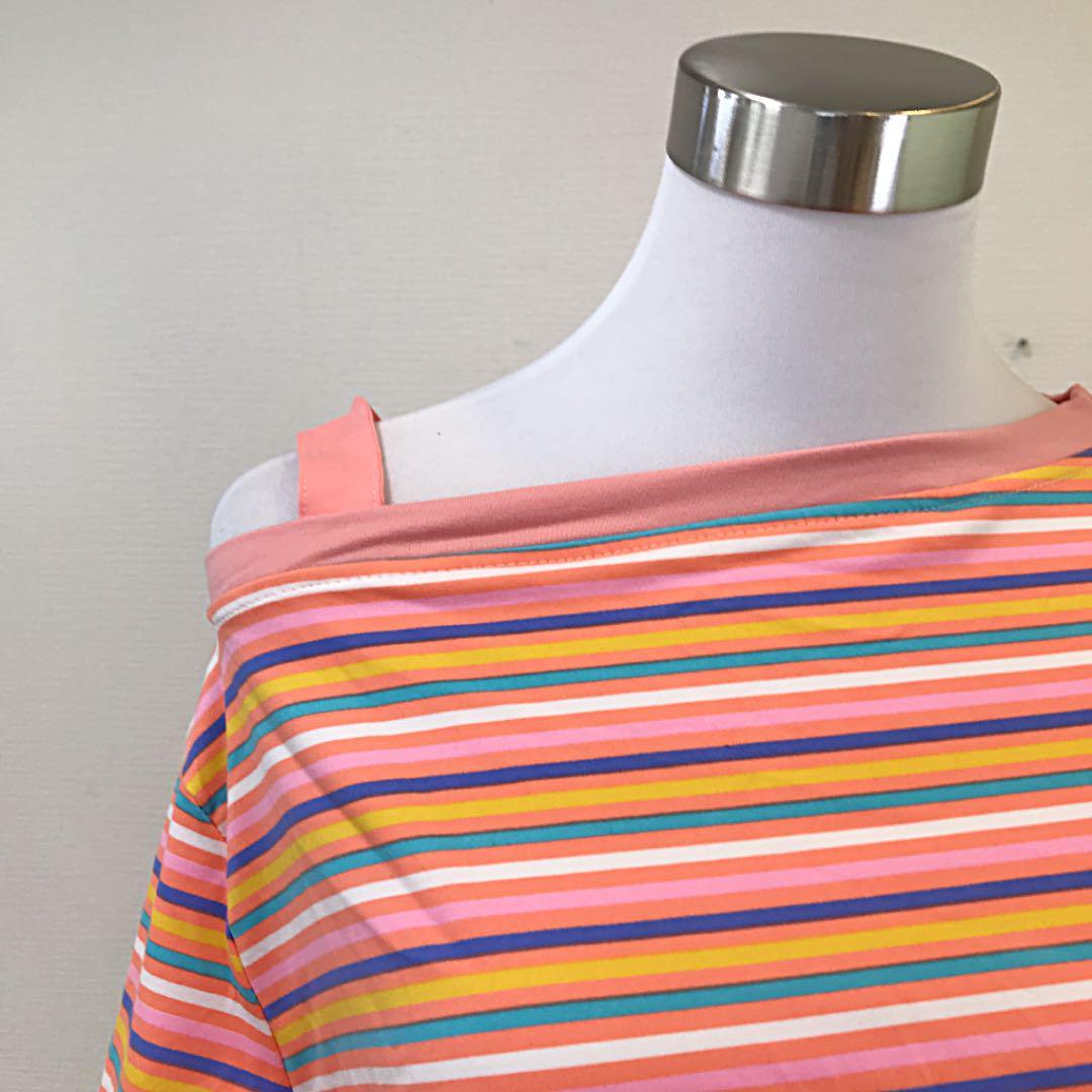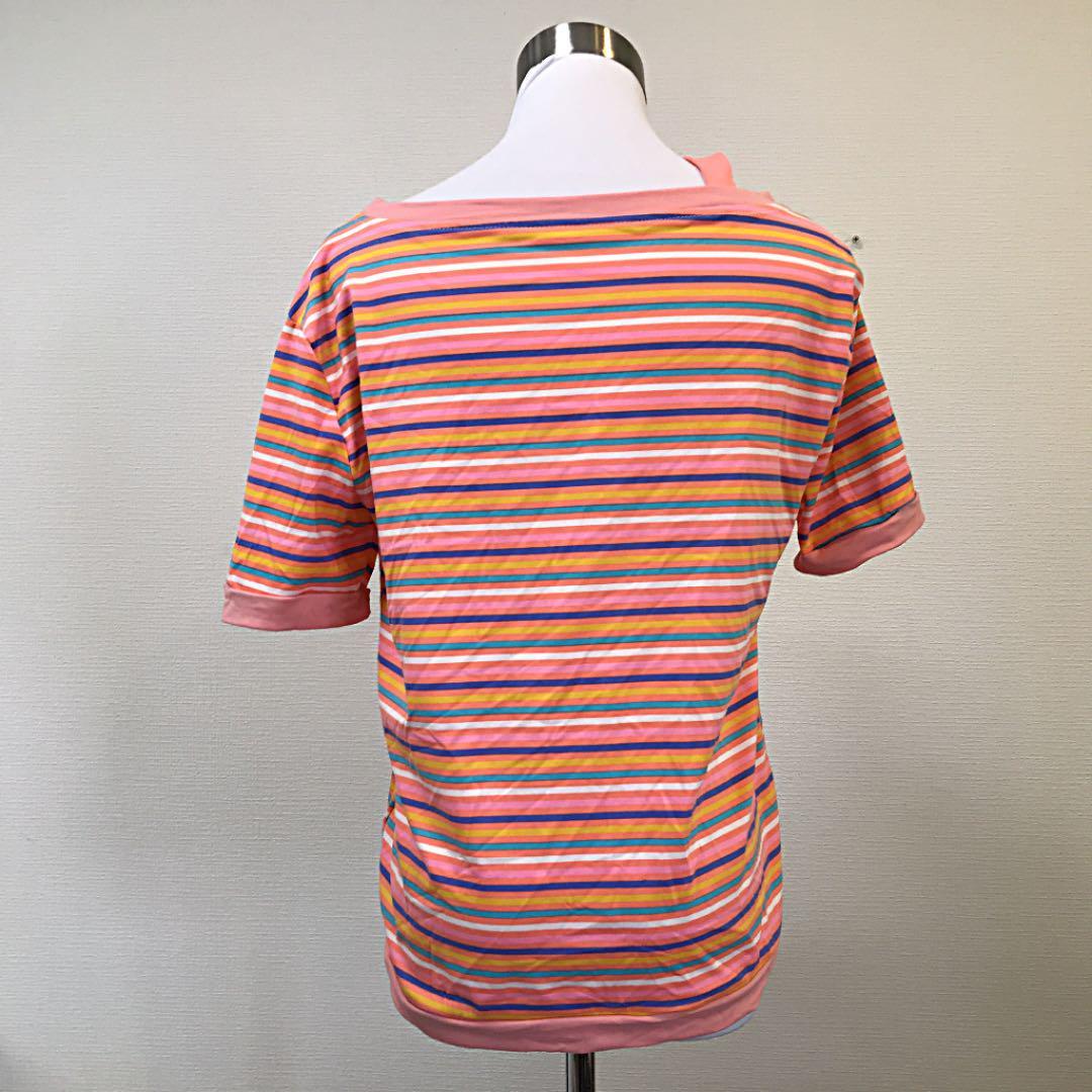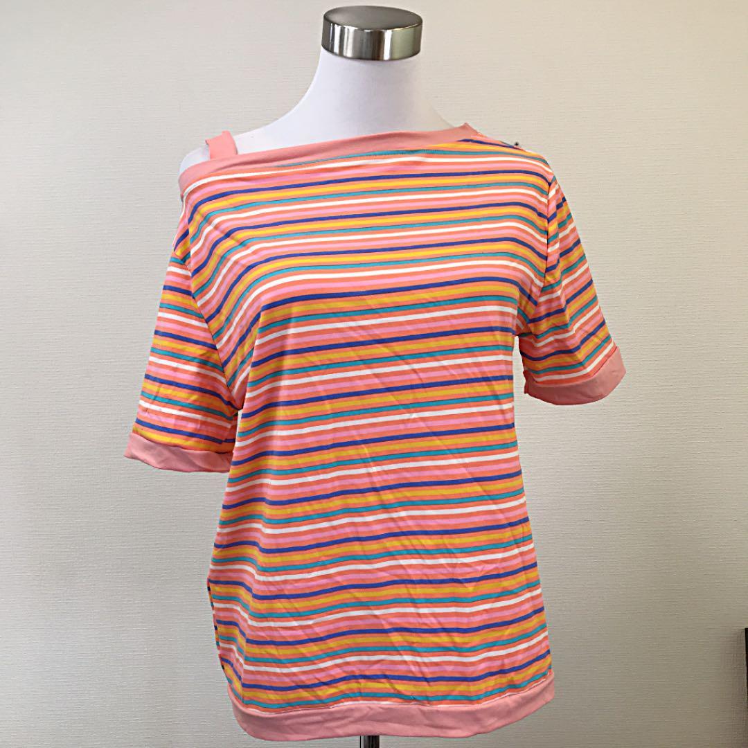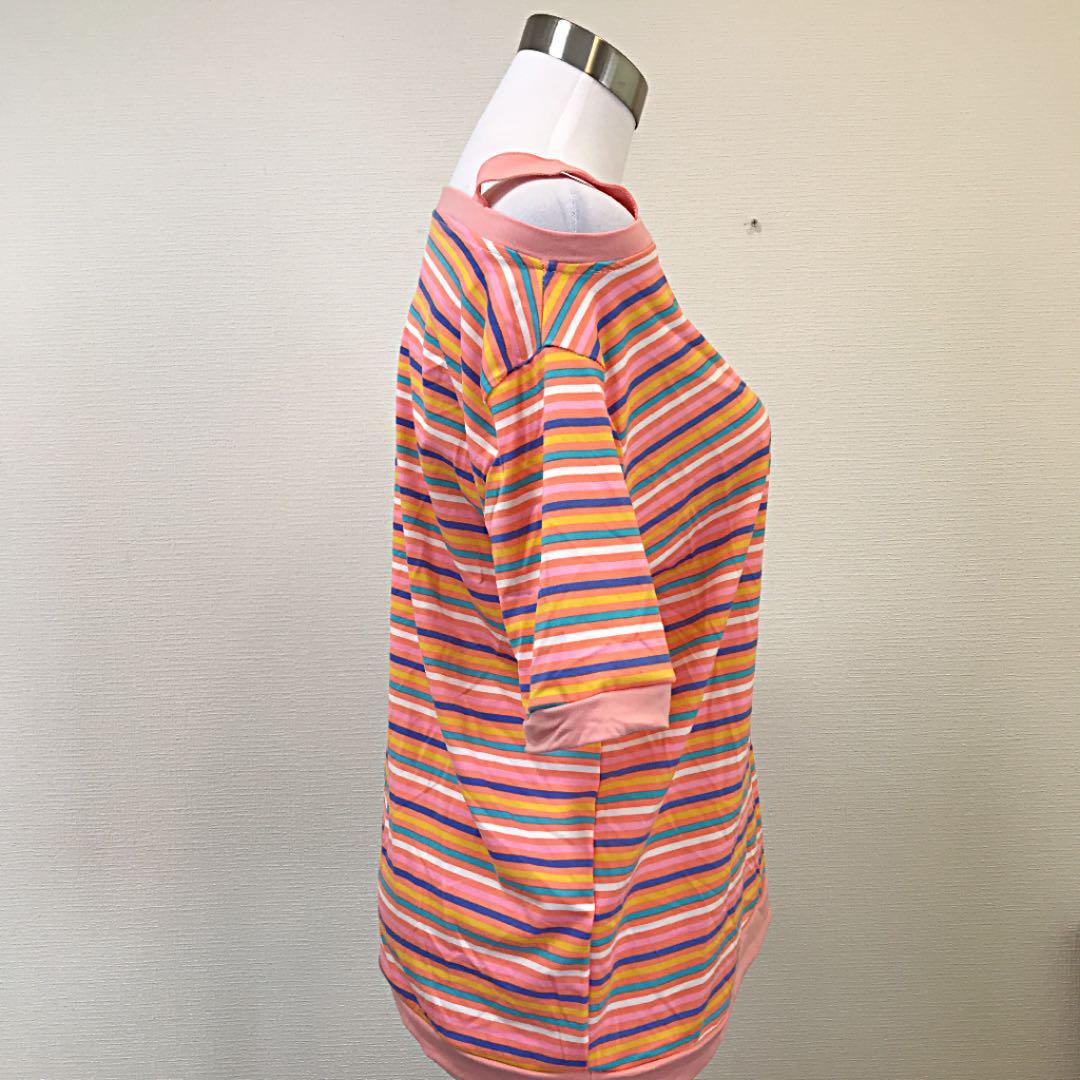肩出し 夏 サマーコーデ ピンクボーダーカラフルカットソー 半袖 Lサイズ