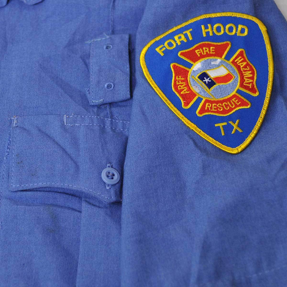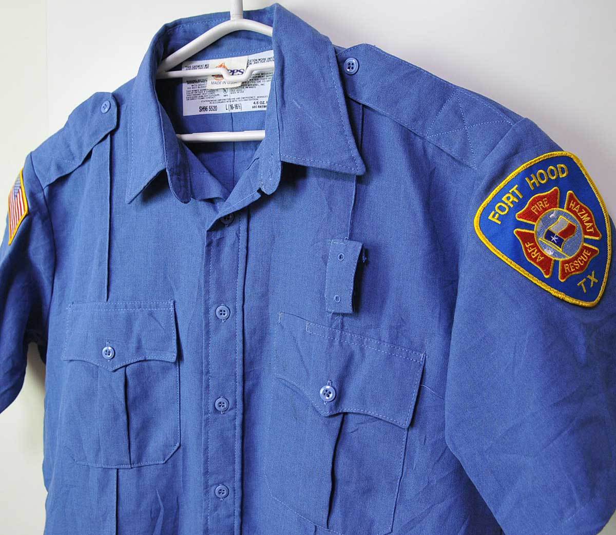 古着●アメリカ消防/レスキュー/飛行機消防 半袖シャツ フォート フッド陸軍基地 L 16-16.5 左胸ポケ汚れ・バッジ付け半分糸ほどけ xwp