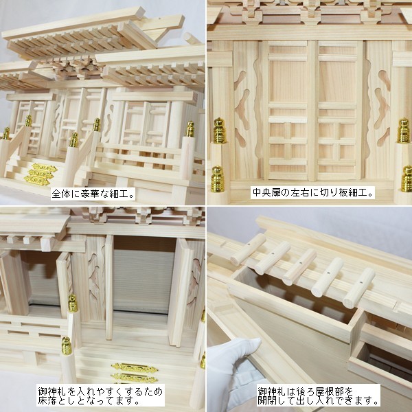 御神札を入れやすくするため床落としとなっており、御神札は裏屋根がフタのようになっておりますので簡単に出し入れできます。