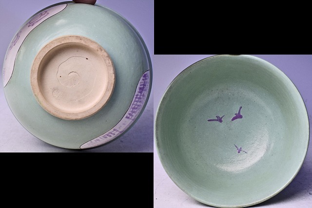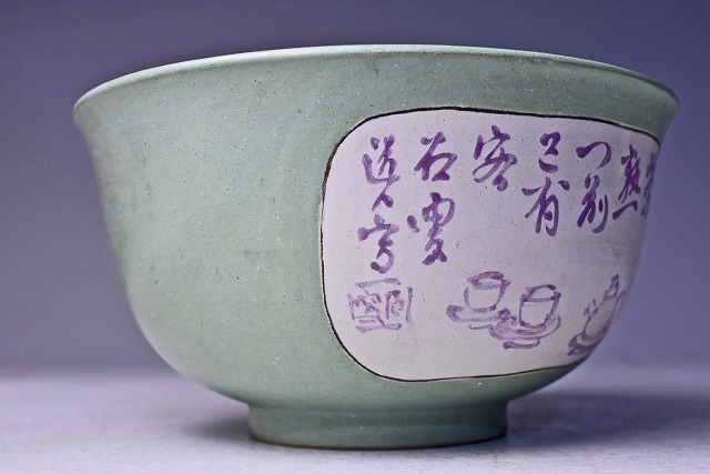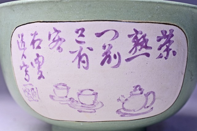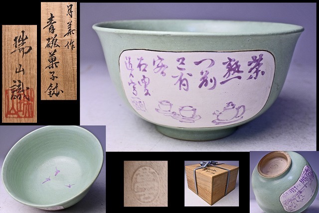 加賀月華 ★ 青磁菓子鉢 ★ 加賀瑞山 識箱 ★ 上作 ★ 窓絵 ★ レトロな色合いの銅青磁タイプ ★ 紫色の画賛 ★ 萬古焼 万古焼