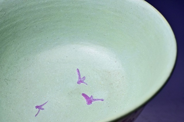 レトロな 銅青磁と 紫色の 絵と文字が 面白い 作品です。