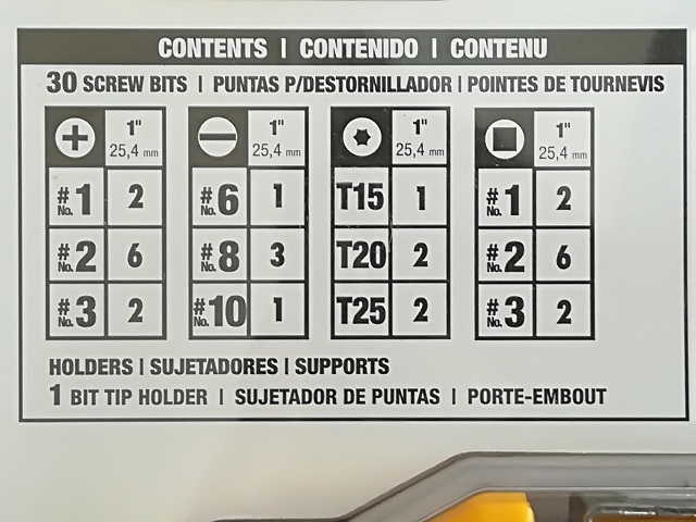 ビットトップホルダー1本とベルトクリップ付プラスチックケース入りビット30本のセットです。