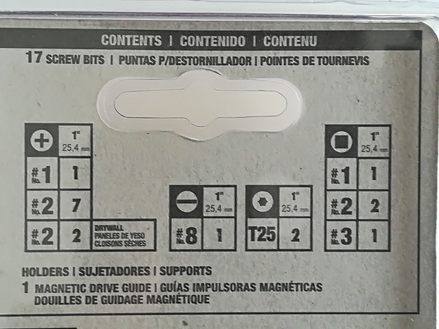 マグネットドライブガイド1本とプラスチックケース入りビット17本のセットです。