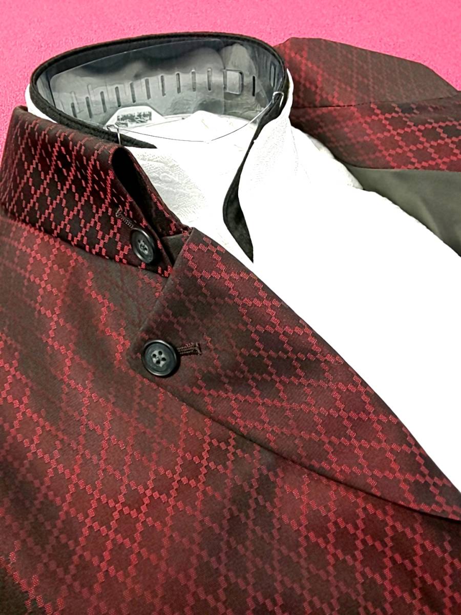 特徴     メタリックの様な光沢ある生地でオシャレな幾何学模様のジャガード織りの変形マオカラースーツです。
