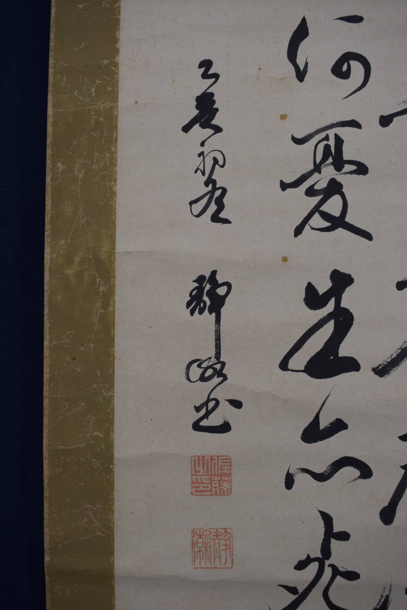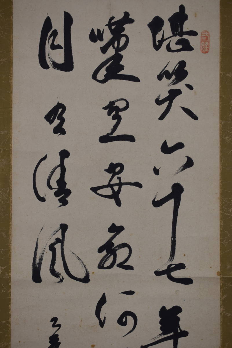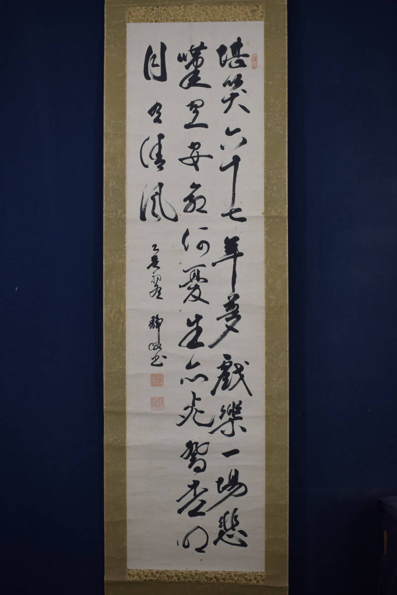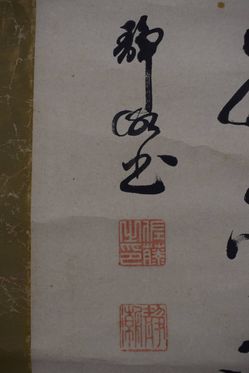 【作品状態】 本紙は紙本肉筆です。本紙は薄汚れ、汚れシミあります。表装は紙表装で、多少の時代感、折れ、巻シワあります。