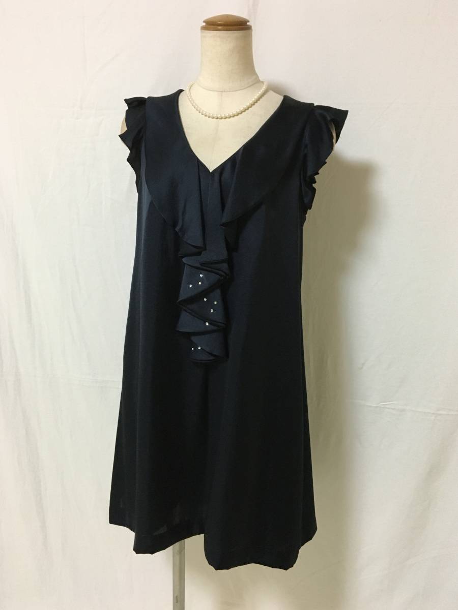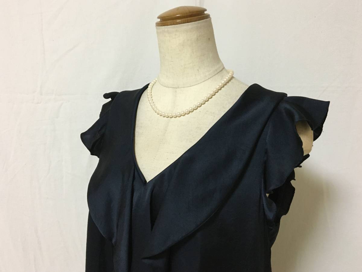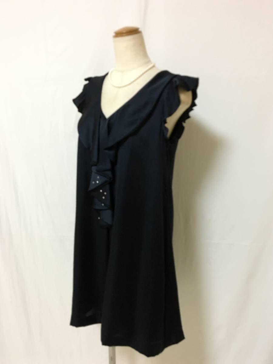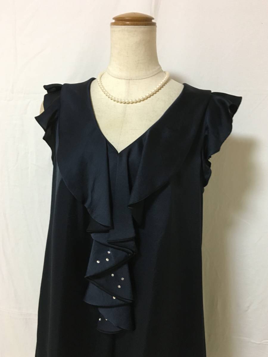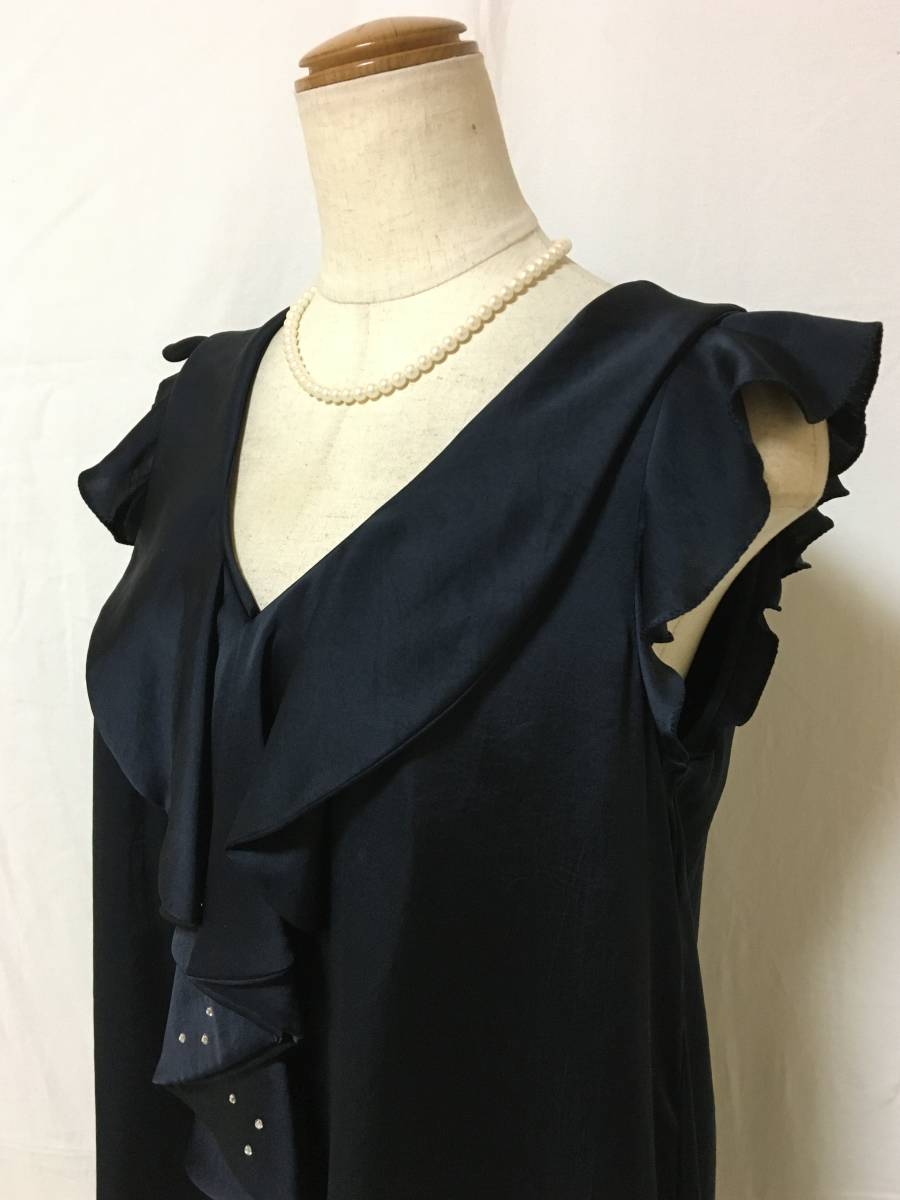 O173美品♪Chestyチェスティ♪ Vカットフリルサテンフォーマルワンピース濃紺(0)Sサイズ即決