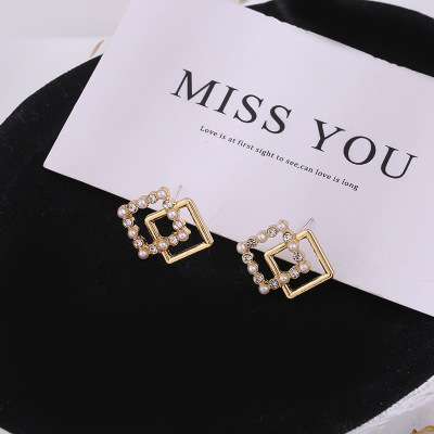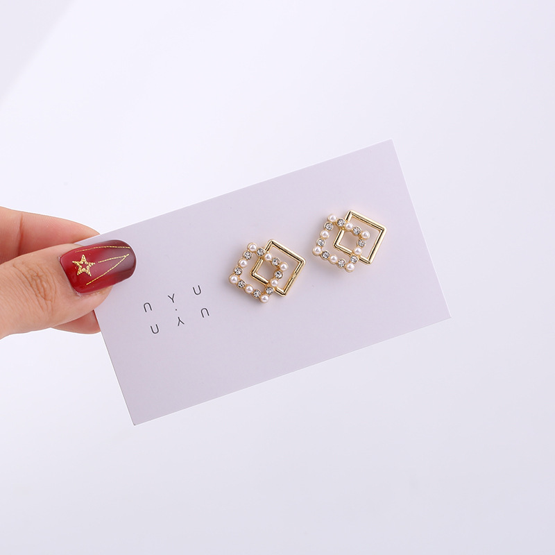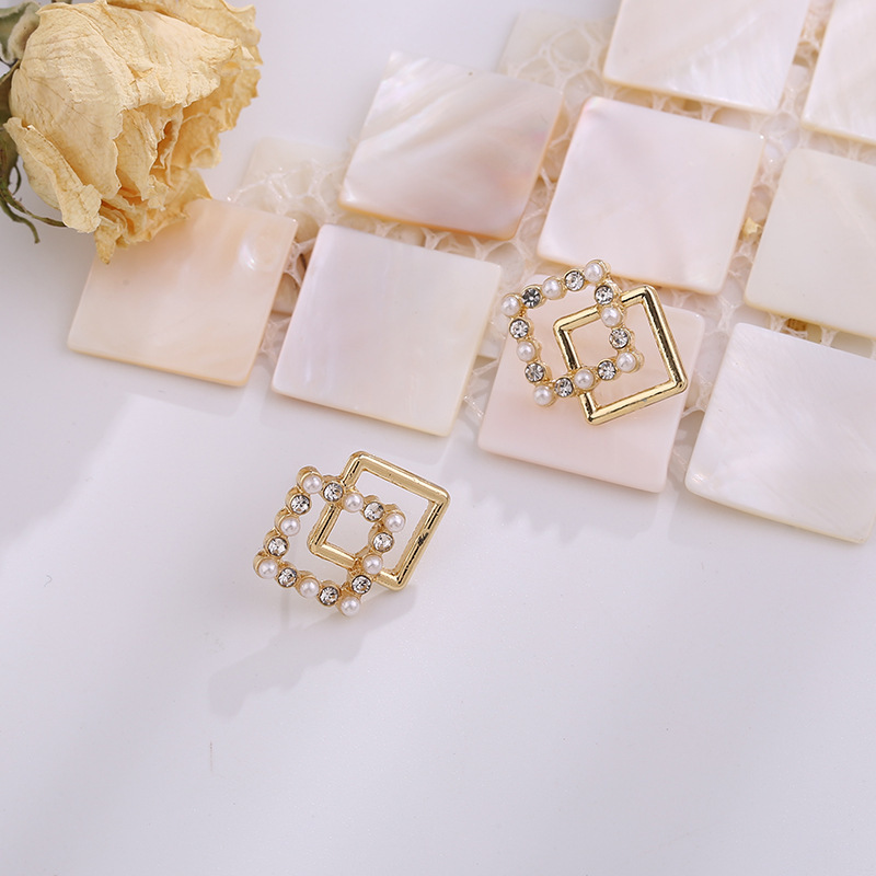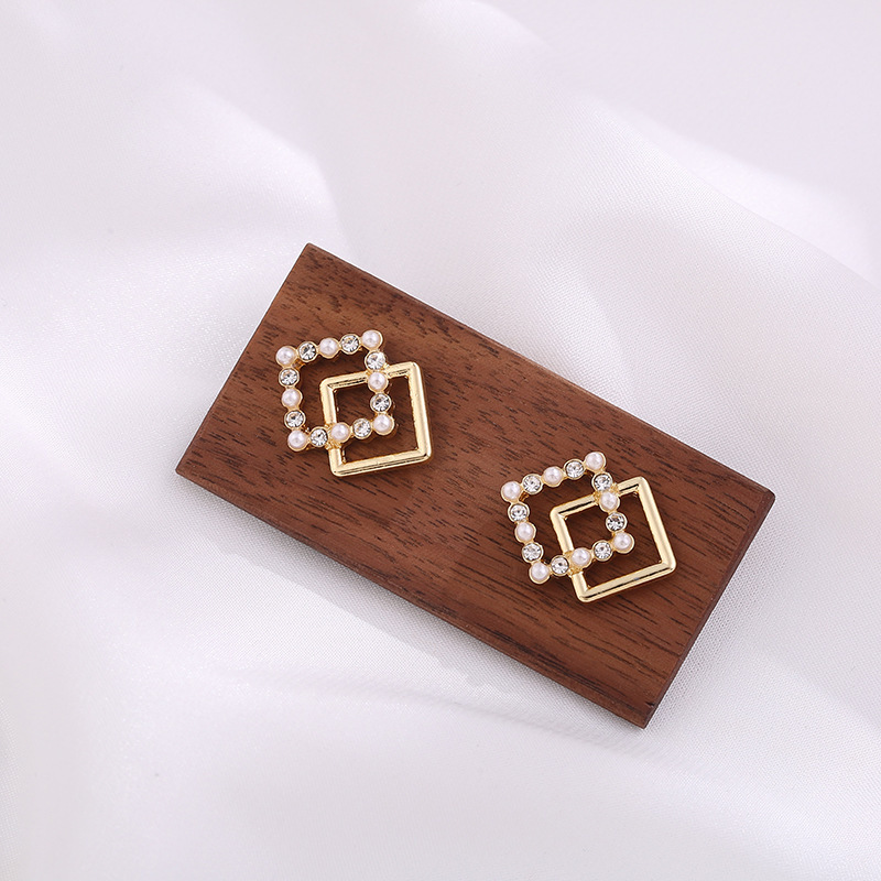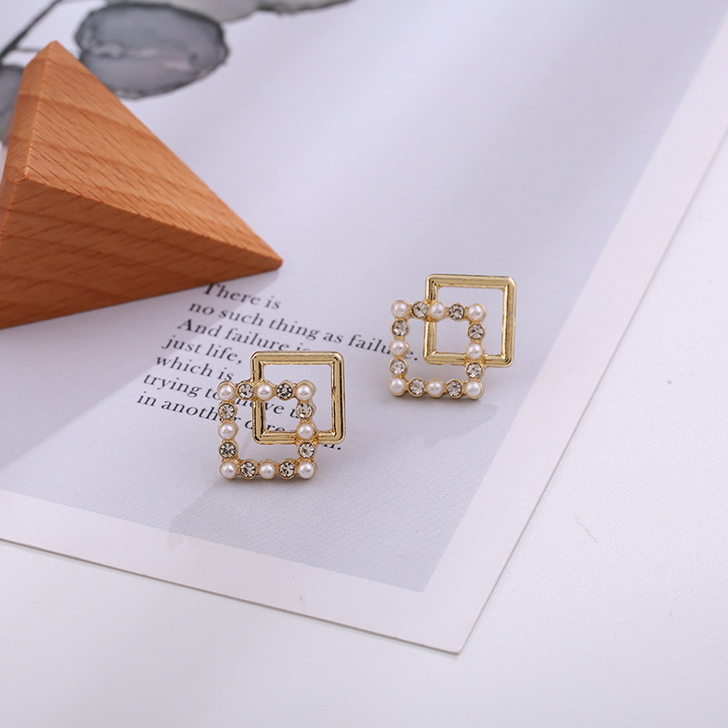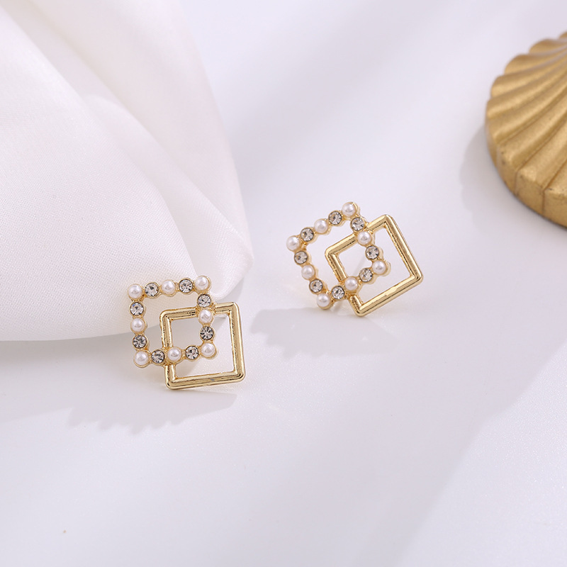 正方形ピアスが重なった形で、どんな装いにも合うシンプルなデザインです。