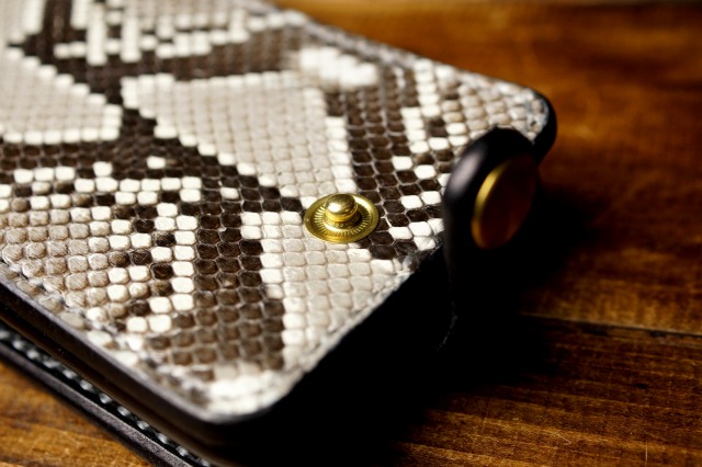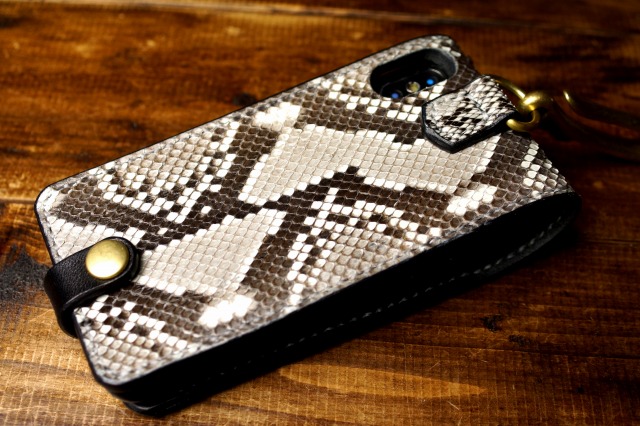 パイソン(蛇革)、国産栃木サドルレザーを使用し、一針一針手縫いで製作した iphoneケースです。