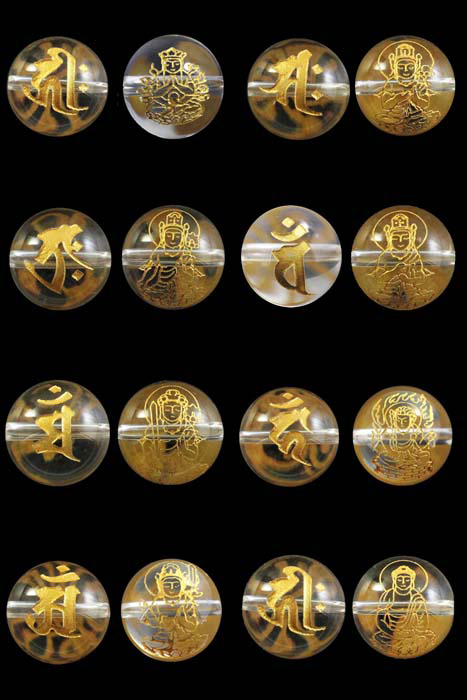 仏像と梵字を1個の水晶玉の表裏に彫刻してます。