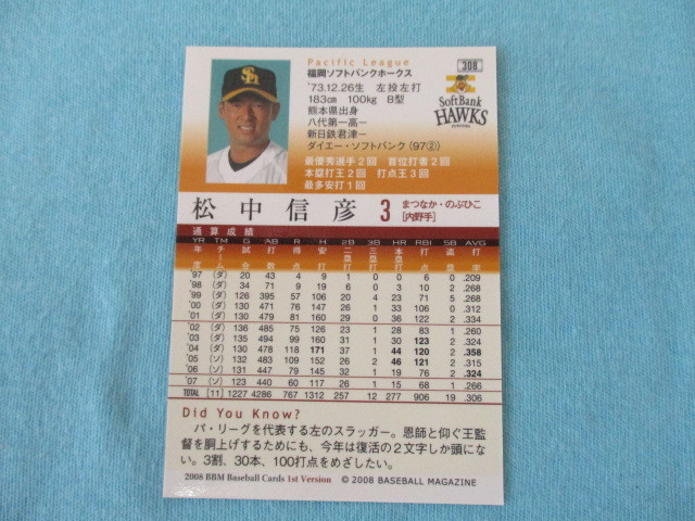 ★BBM 2008★1st Version〔308 松中信彦 福岡ソフトバンクホークス〕トレカ♪