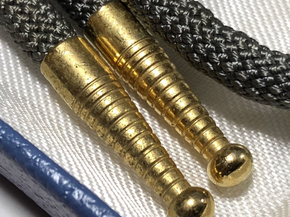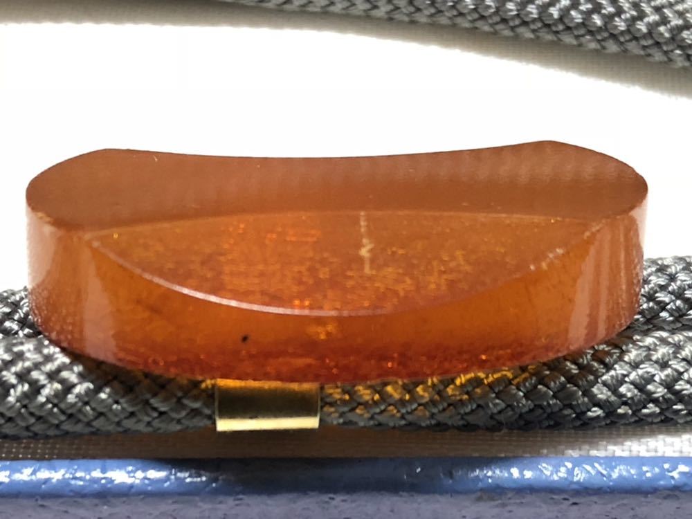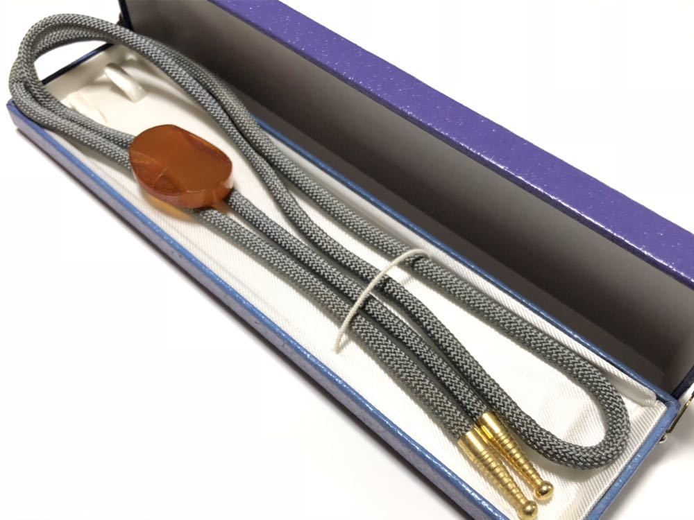 本琥珀を使用した、オーバルデザインカットのループタイです。金属面にサビがあります。ケース付属です。