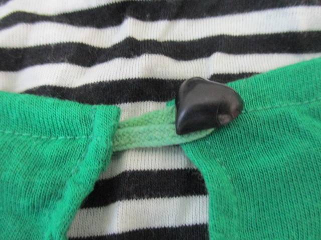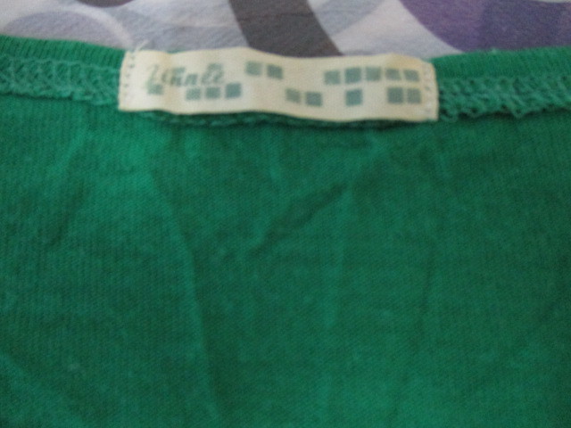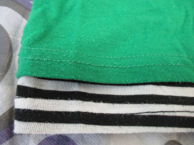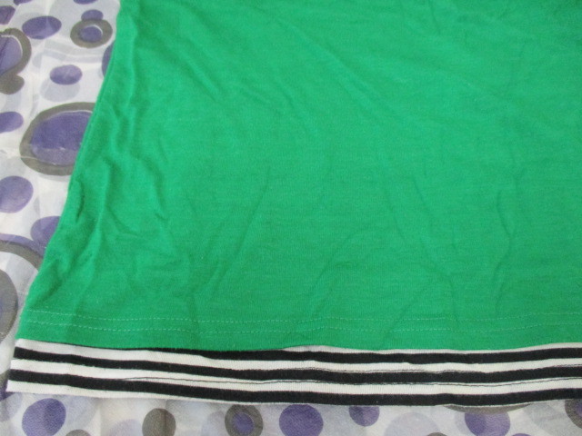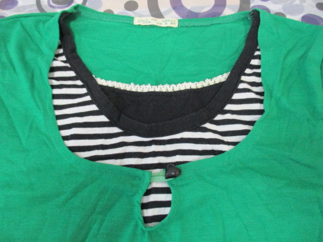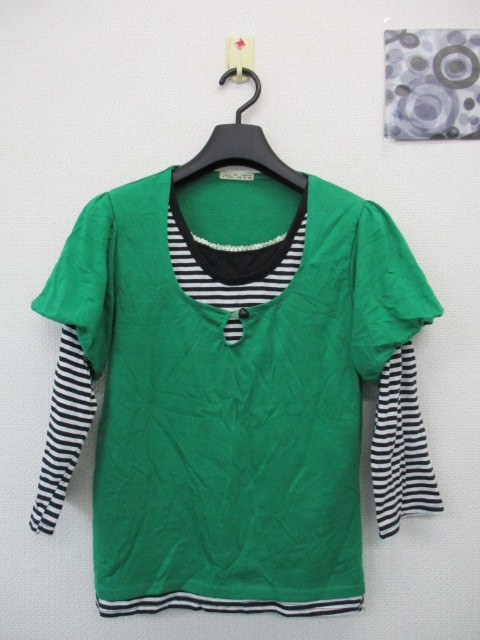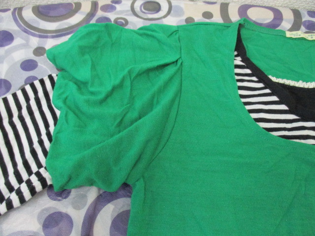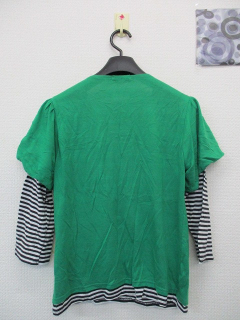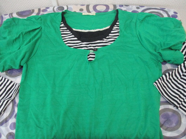 ★7分袖トップス バルーン袖 カットソー 重ね着風 グリーン×白黒ボーダー(LL)