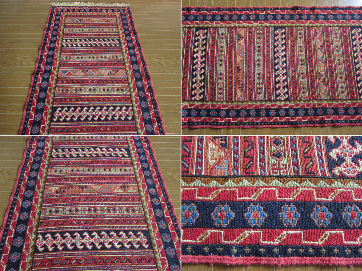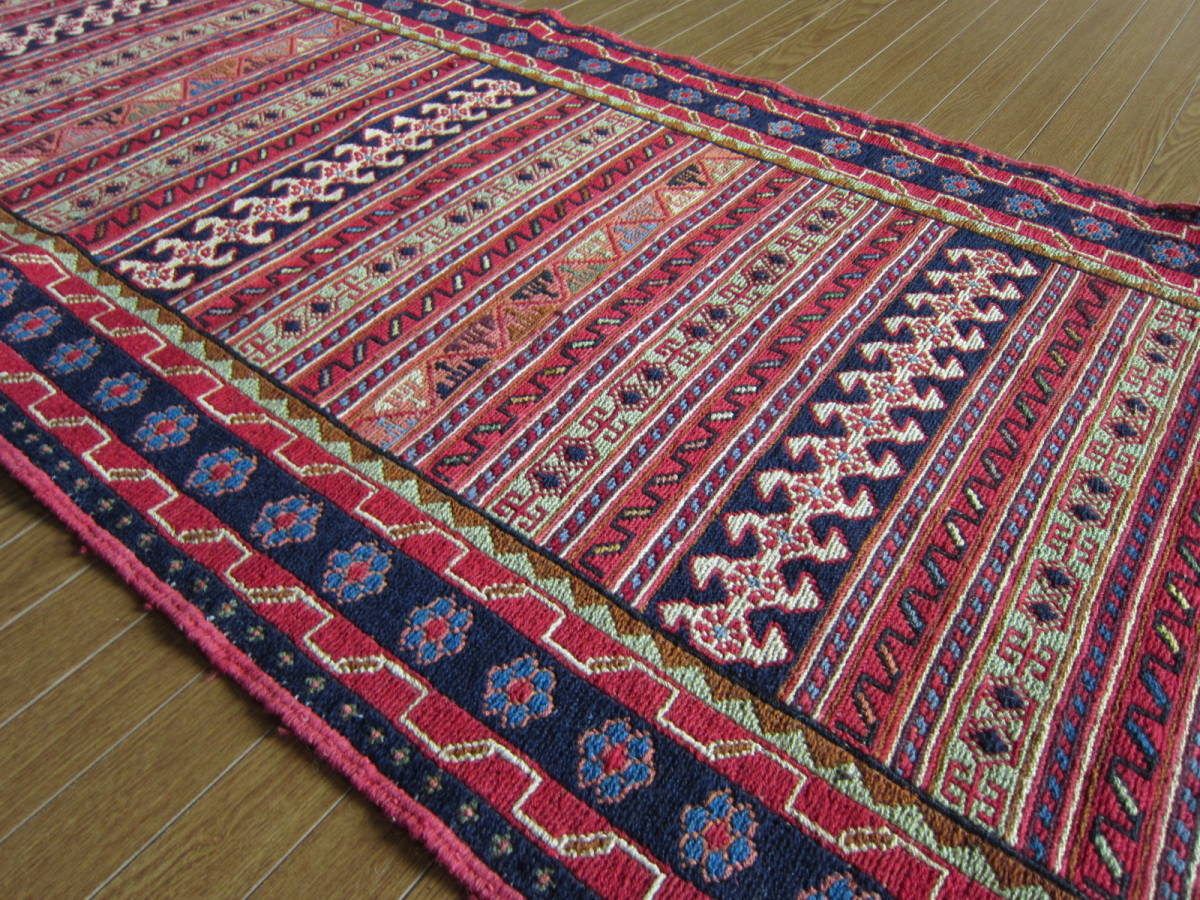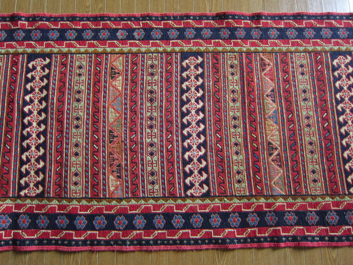 商品説明 | ★素材 : ウール・手織り・スマック織り ※スマック織りとは、イランのキリムの織り方の技法です。 土台の縦糸と横糸の上にもう一本横糸を絡めるように 巻き込んで織っていく高度なテクニックで、 刺繍のように細かな文様を描けることができます。 スマック織りは裏面に模様の糸を渡してあるので 片面使いのキリムになります。 ★サイズ : 約 283×75 cm (房を含まない長さです) ★産地 : イラン・アゼルバイジャン ★状態 : 新品 kxpgs342+ZIBACARPET絨毯 kxpgs342+ZIBACARPET取扱いペルシャ絨毯 FARSHEZIBA_キKILIMキリム |