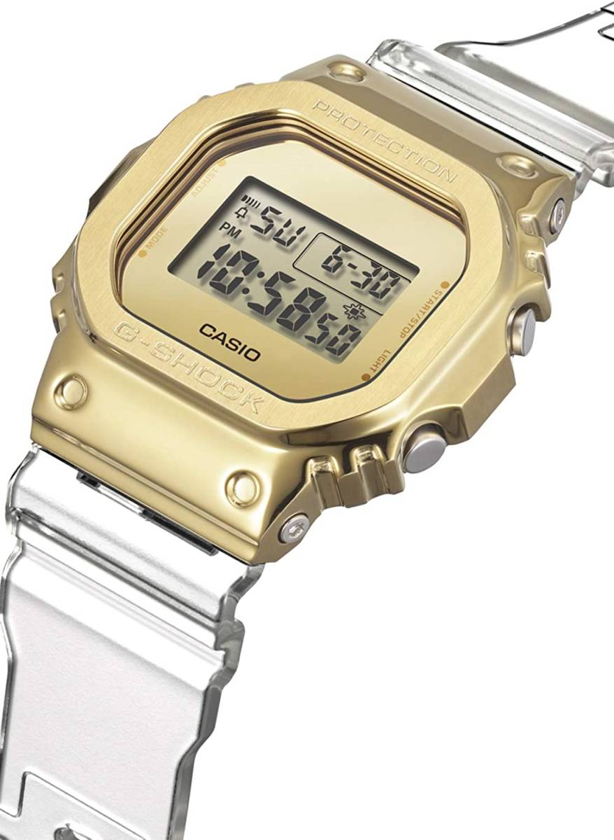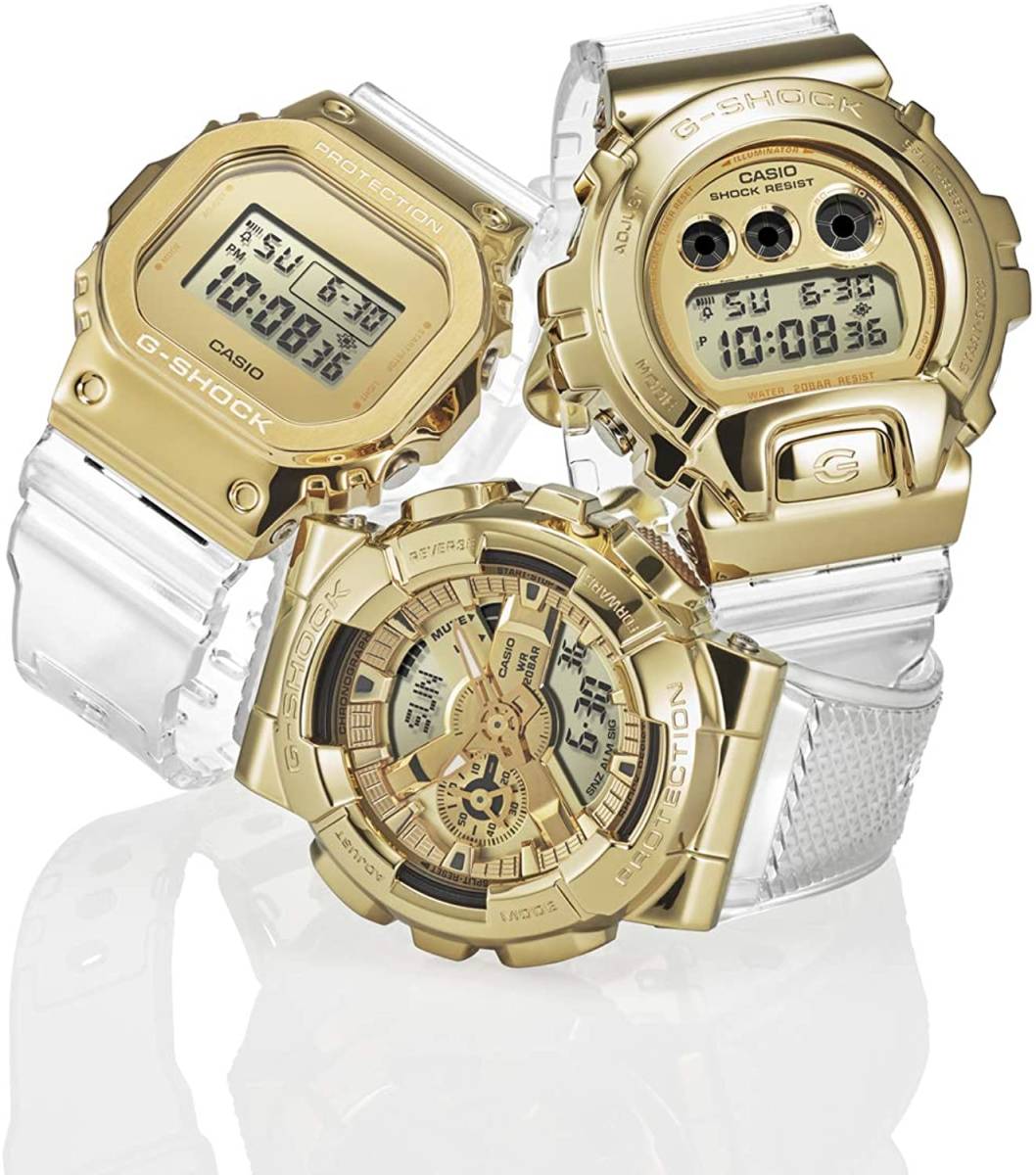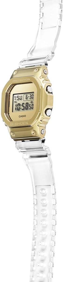 タフネスを追求し進化を続けるG-SHOCKの、ステンレス製ベゼルを採用した硬質かつファッショナブルなMetal Coveredラインから金塊をモチーフにデザインしたシリーズです。 ベースモデルは初代から受け継がれるコンセプトはそのままに、時計としてのクオリティを追求し外装や装着性の進化に磨きをかけたGM-5600を採用。 バンド部は透明のクリア樹脂を採用し時計部のゴールドを引き立たせ、洗練かつファッショナブルなデザインに仕上がりました。 Metal Coveredラインにゴールドカラーが映える高級感溢れるG-SHOCKです。
