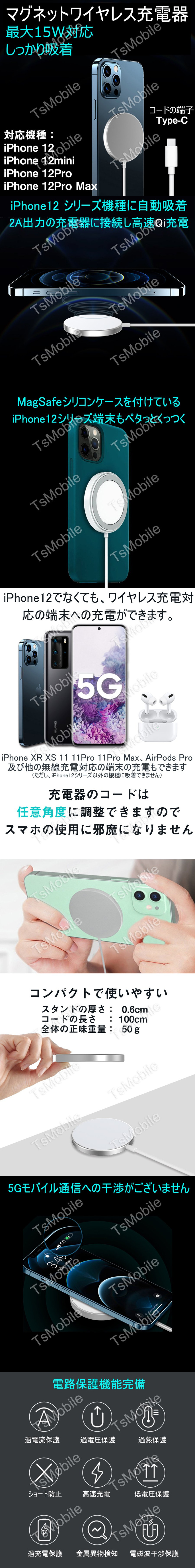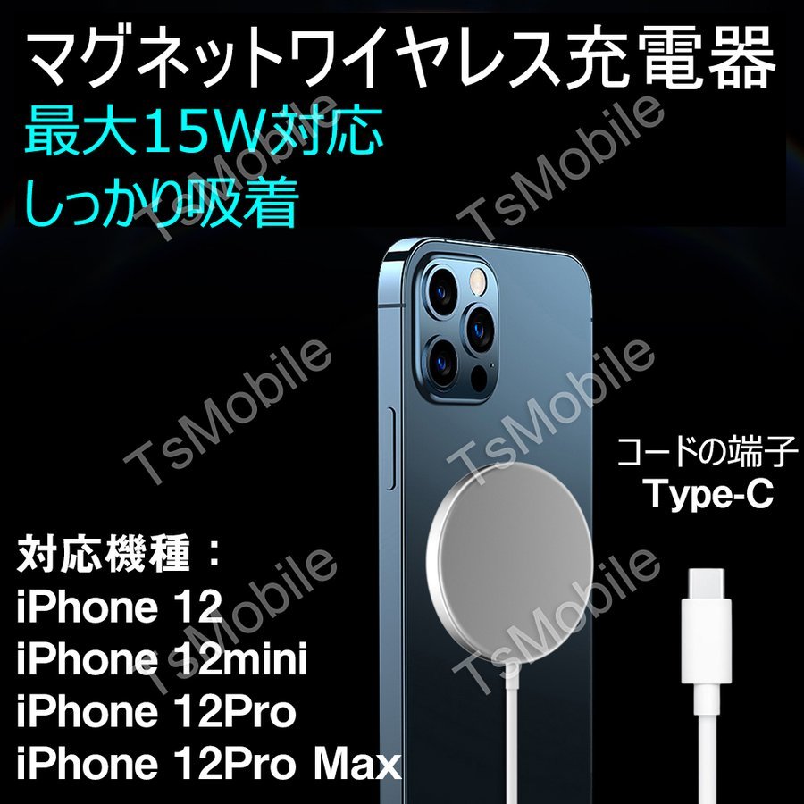 | TypeCプラグ iphone12 12Pro Max 12mini用ワイヤレス充電器 マグネット MagSafeシリコンケース対応充電器 磁気吸着 ワイヤレス急速充電器 最大15W 最大15Wの急速充電が可能です。マグネット内蔵ですので、iPhone12シリーズの機体の裏に磁気で吸着して無線充電できます。 この充電器のプラグはUSBタイプです。Type-Cポートのコンセントへ接続して使用します。 コードの長さ:1m 対応機種: iPhone12, iPhone12Pro, iPhone12Pro Max, iPhone12 mini |