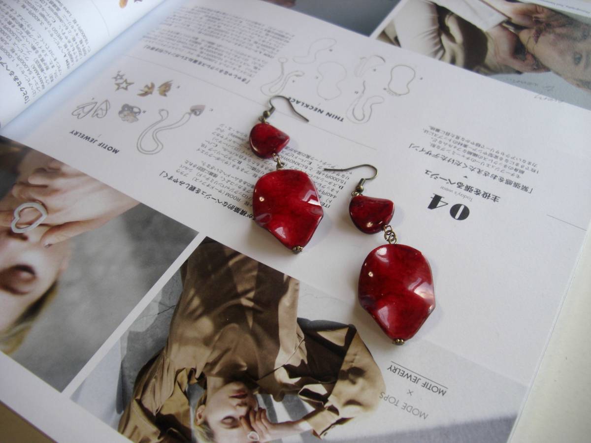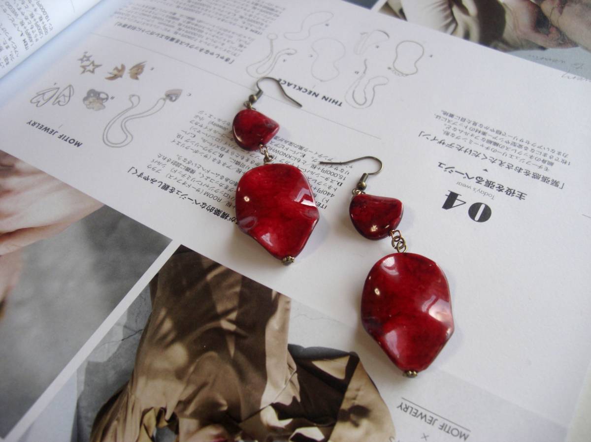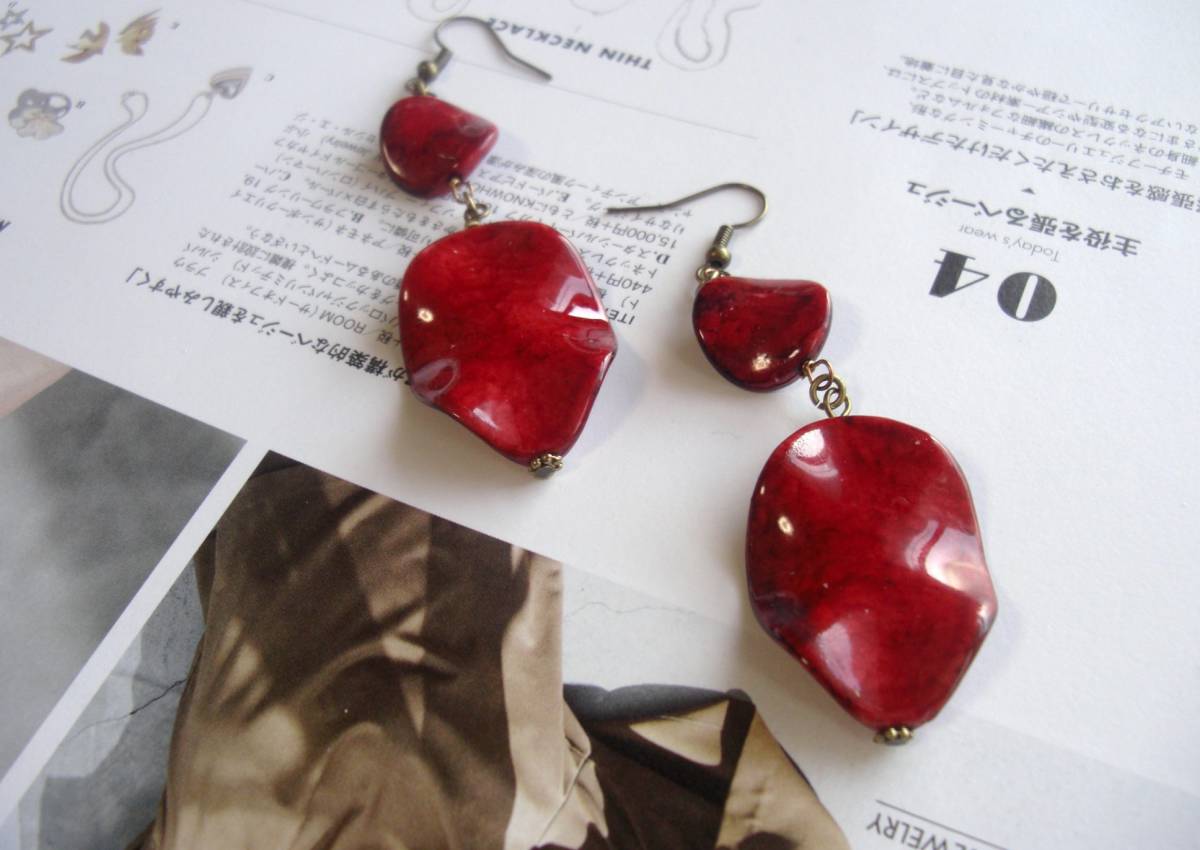巴里の記憶・・シリーズです♪深い赤に惹かれて・・シックな色のピアスです!深い赤がアンティークな雰 囲気です♪15ミリから35ミリ位の樹脂ビーズは軽いので色々なシーンで楽しんでいただけます♪長さは 8・5センチ位です♪イヤリングに変更出来ます♪お揃いのネックレスやブレスレットも出品して います♪シンプルで飽きのこないいつまでも着けられるデザインを考えて作りました!ハンドメイドをご理解頂いてノークレーム、ノーリターンでお願いします♪