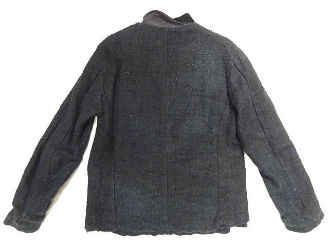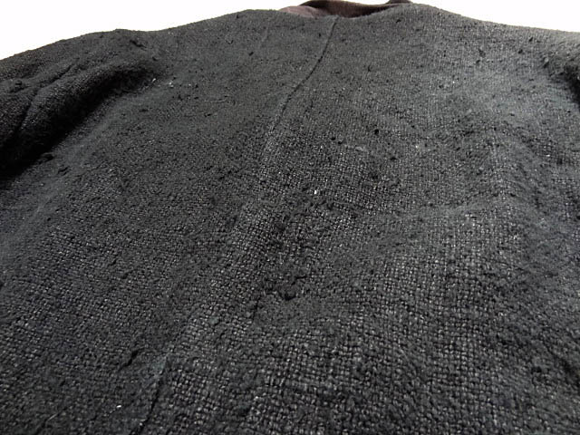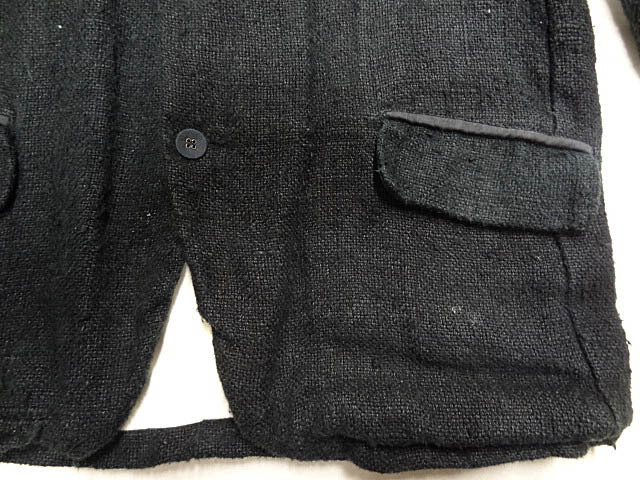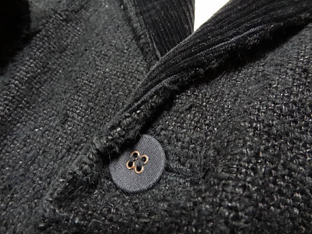 とても手の込んだデザインです。主な素材はジュートです。少しゴワ感のある麻/リネンのような感じです。襟部分は黒太畝コーデュロイと黒スエードの切り替えになった手間のかかるデザインです。ジュート素材のジャケットというの世の中にほとんどないのでとても希少です。