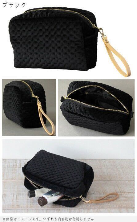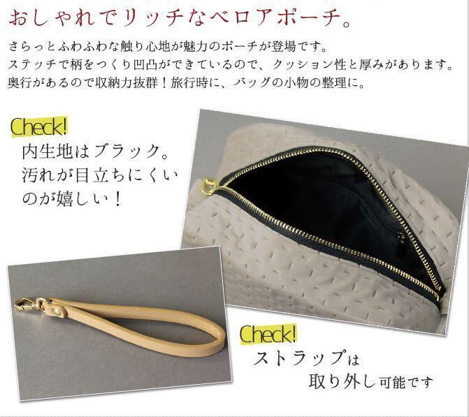 ■さらっとふわふわな触り心地が魅力のベロア生地のポーチ。■ステッチで柄をつくり凹凸ができております。■内生地はポリエステル生地だから汚れにくく、黒なので汚れが目立ちません。ファスナー付き内ポケット付き。■ストラップは取り外し可能です。■奥行があるので収納力抜群!旅行時に、バッグの小物の整理に。