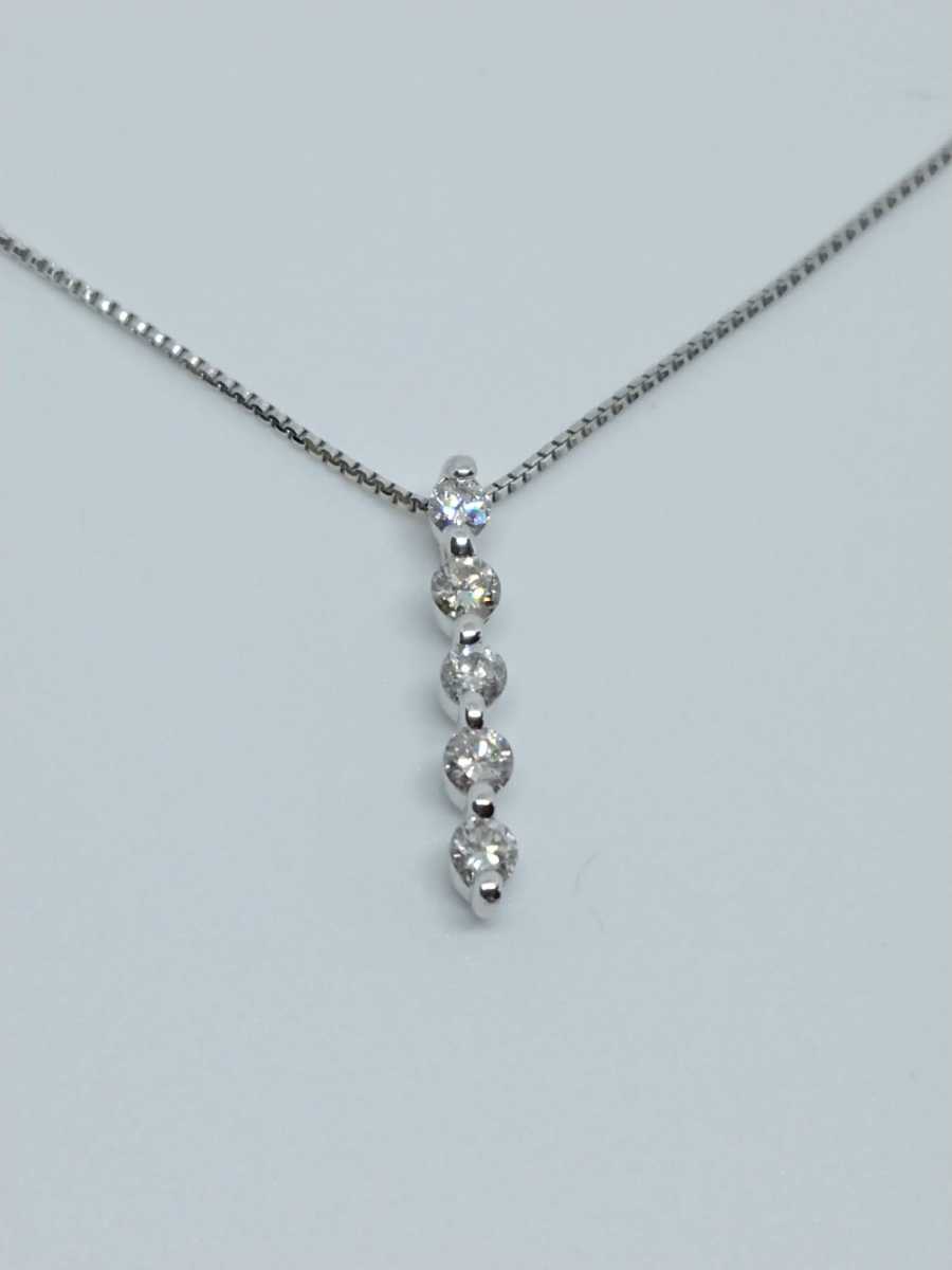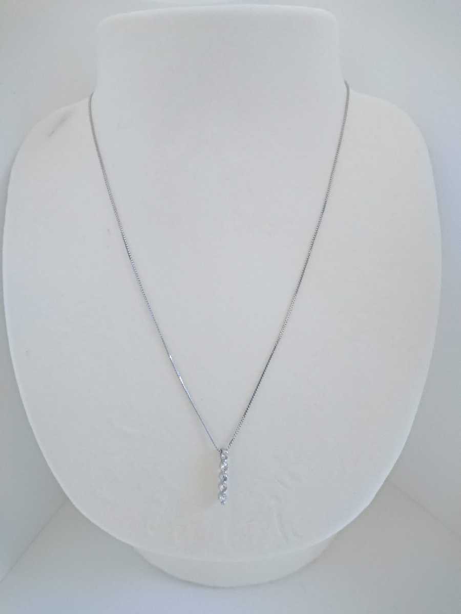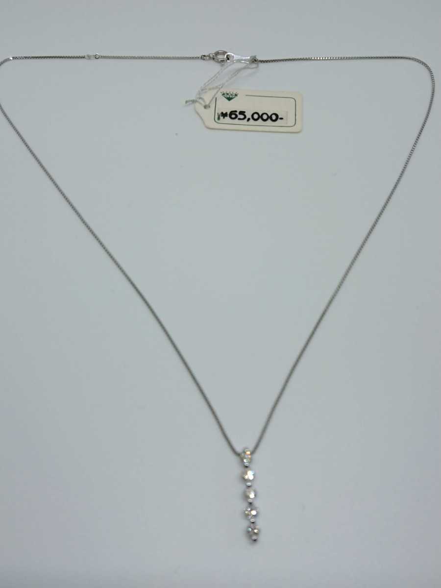 縦にダイヤが5石、5ストーンのネックレスになっており、シンプルで飽きのこないデザインとなっています。