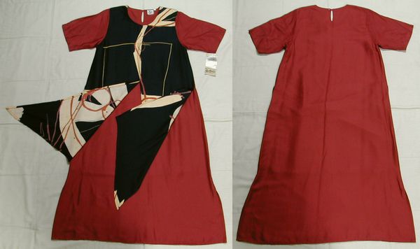 茶系無地のワンピースに柄素材を重ねたワンピースです。