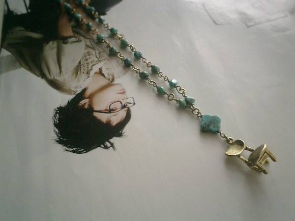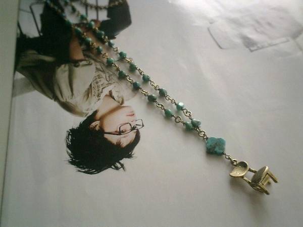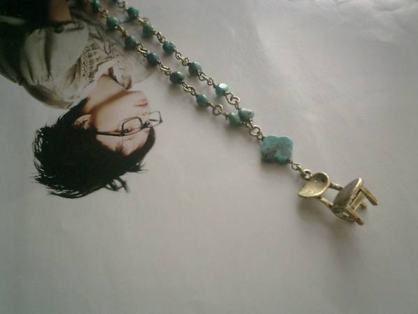 ボヘミアン・ガール・・シリーズです♪やさしい時間・・キュートなターコイズとチェアーチャームのネックレスです♪シックなターコイズにレトロモダンなチェアーのチャームを合わせて大人可愛い表情です♪ターコイズは5ミリ位のタンブルと10ミリ位のフラワーモチーフです♪長さは全長77センチ位で調節自由です♪トップは4センチ位です♪お揃いのブレスレットやピアスも出品しています♪シンプルで飽きのこないいつまでも着けられるデザインを考えて作りました♪ハンドメイドをご理解頂いてノークレーム、ノーリターンでお願いします