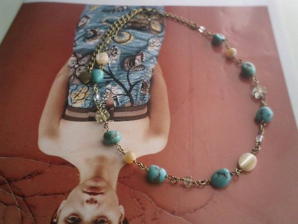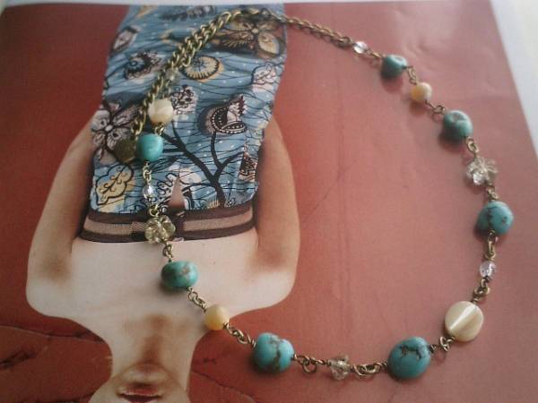ガラスの靴の女の子・・シリーズです♪夏への移ろい・・シックなターコイズのネックレスです♪ターコイズは10ミリから12ミリ位のタンブルです♪マザーオブパールの4ミリ、6ミリの丸玉、10×8ミリ位のオーバルやお花のチェコビーズやデザインビーズを合わせて爽やかな表情です♪長さは全長50センチ位で調節自由です♪お揃いのネックレスやブレスレットも出品しています♪シンプルで飽きのこないいつまでも着けられるデザインを考えて作りました!ハンドメイドをご理解いただいてノークレーム、ノーリターンでお願いします