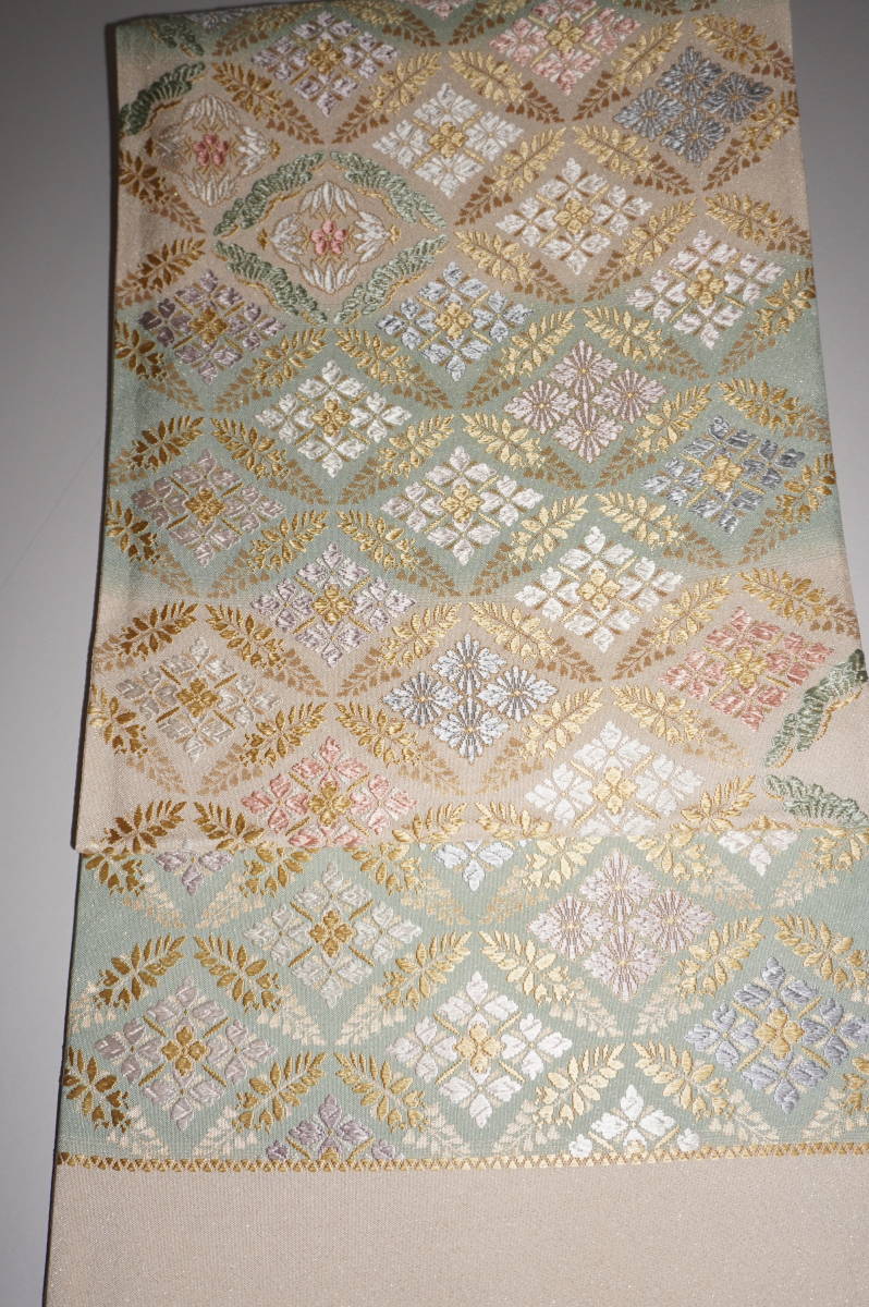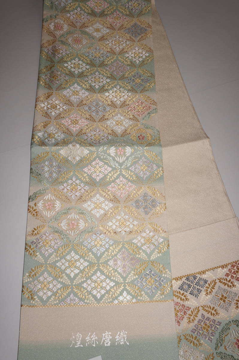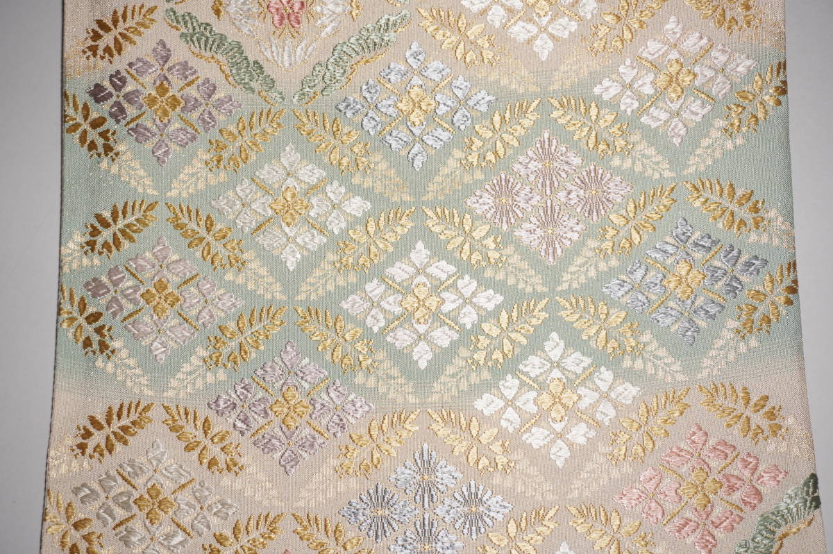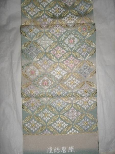 仕立てつき。訪問着用6通柄袋帯 西陣織り 絹90%その他10%西陣産地証明証紙付き 薄白緑+白白茶色(砂金チラシの綴れ織り唐織)  新品み仕立て品ですがこのお値段で仕立てつきで、納品です。なお、最終日まで待っていただかなくとも、入札した時点でオークションは終了し落札者となります。お値段的にもお安く設定いたしましたお買い得品です(証紙のついた西陣六通柄袋帯です)。もちろん芯込みの仕立て付きですが、仕立てなしの場合でも金額は変わりません。