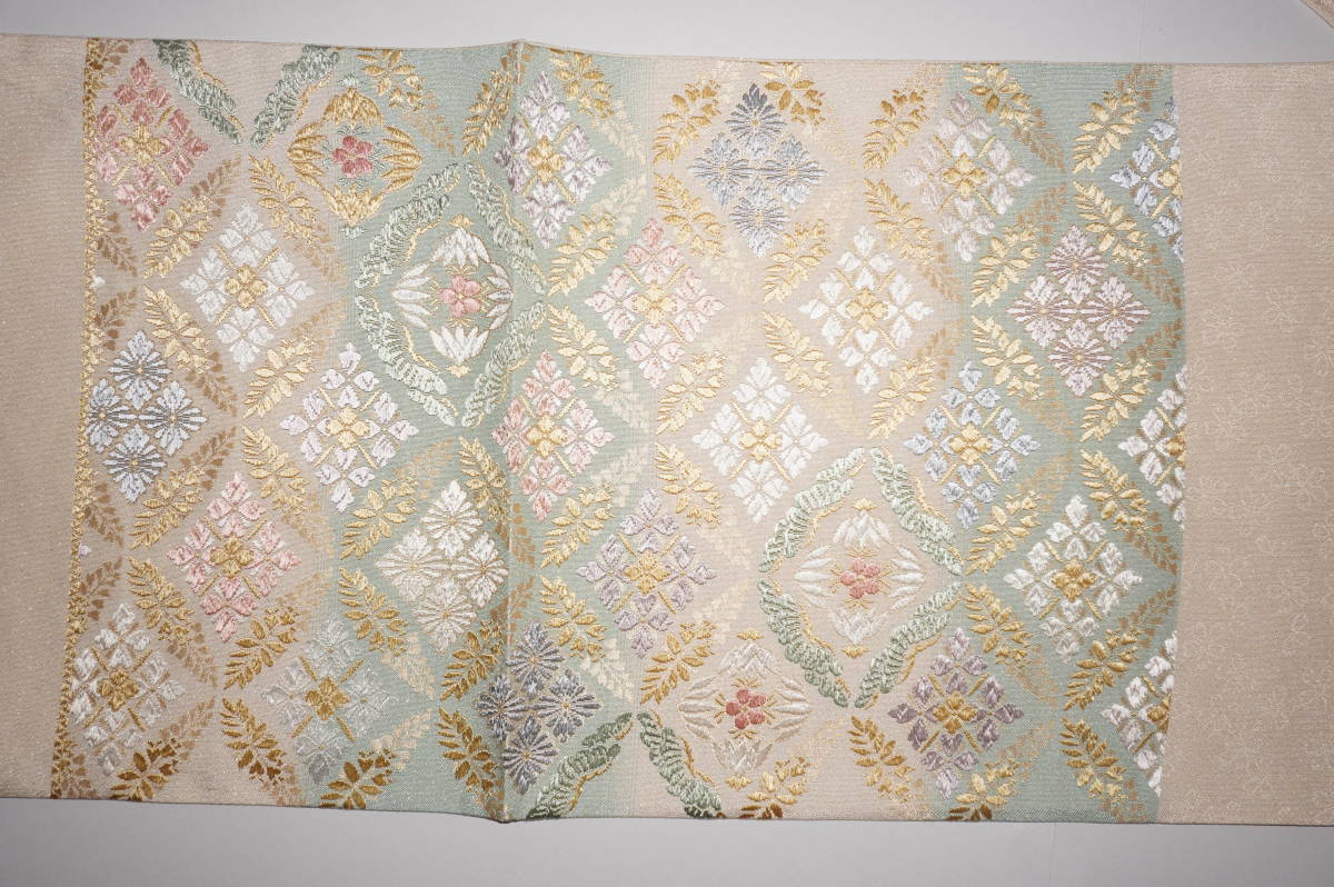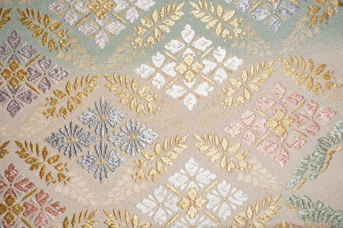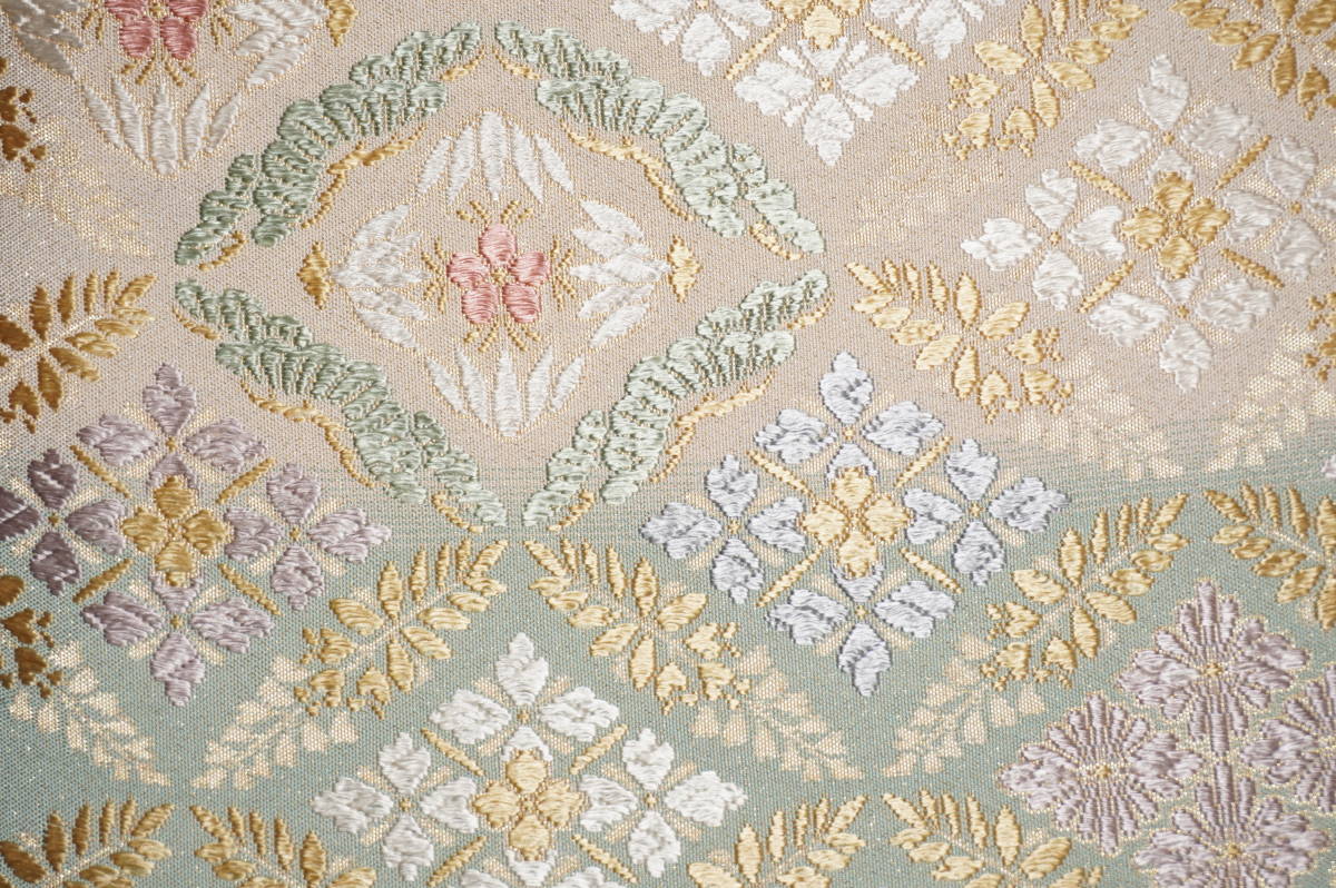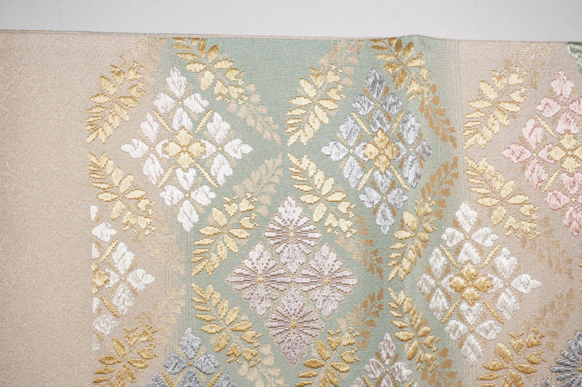 仕立てつき。訪問着用6通柄袋帯 西陣織り 絹90%その他10%西陣産地証明証紙付き 薄白緑+白白茶色(砂金チラシの綴れ織り唐織)  新品み仕立て品ですがこのお値段で仕立てつきで、納品です。なお、最終日まで待っていただかなくとも、入札した時点でオークションは終了し落札者となります。お値段的にもお安く設定いたしましたお買い得品です(証紙のついた西陣六通柄袋帯です)。もちろん芯込みの仕立て付きですが、仕立てなしの場合でも金額は変わりません。