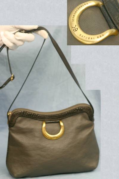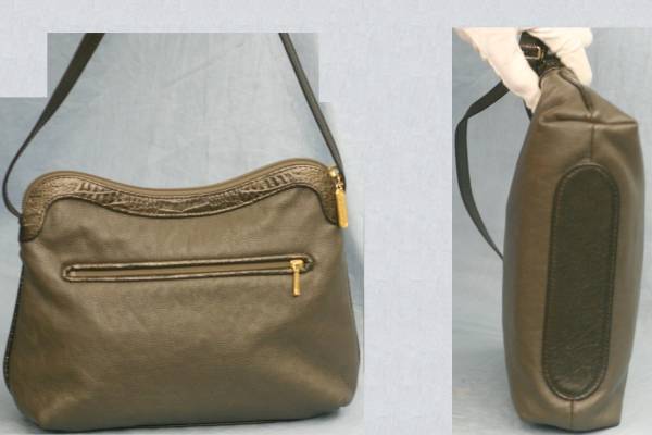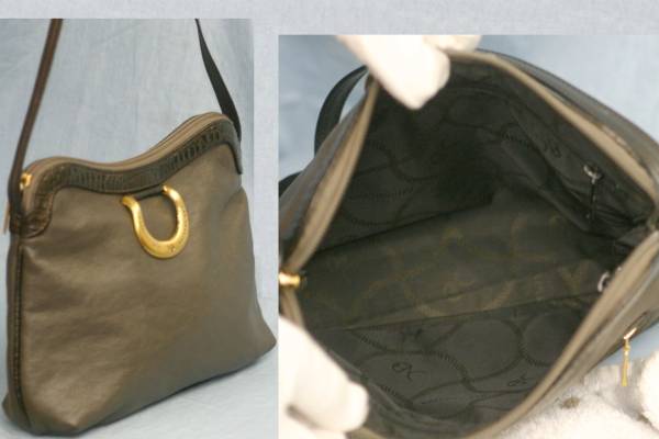 ハンドメイドのバッグ | サイズは上横22下横26x20x7cmでショルダーの長さは110㎝位で斜めがけ可能です。中に15㎝位のファスナー付ポケットが2個あります。正面の大きい金色金具にハンドメイド、ナチュラルバッグの刻印がございます。お色は表現が難しいですがカーキグレーと思います。全体的に目立つ傷、スレの無い美品です。管理番号○C4-894-6 |