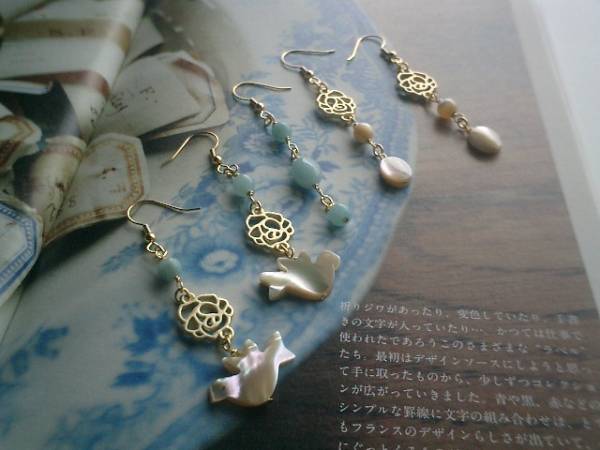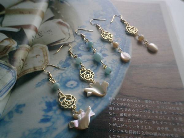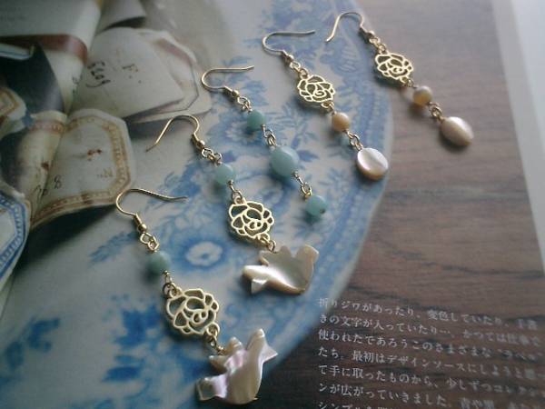 ロマンチック見本帳・・シリーズです♪物憂げな色を集めて・シックなアマゾナイトとマザーオブパールのピアス5点セットです♪お揃いのペアが2組とデザイン違いが1本で合わせて5本セットです♪色々な組み合わせで楽しんでいただけます♪小鳥さんや薔薇を合わせて大人のロマンチックしています♪アマゾナイトは6ミリの丸玉と10×8ミリ位のオーバルです♪ベージュのマザーオブパールは6ミリの丸玉に10×8ミリのフラットオーバルです♪同じマザーオブパールの小鳥さんや繊細なマットゴールドの薔薇の透かしチャームを合わせてさりげなく華やかです♪長さは全部7センチ位です♪イヤリングにも変更出来ます♪♪お揃いのネックレスやブレスレットも出品しています♪シンプルで飽きのこないいつまでも着けられるデザインを考えて作りました!ハンドメイドをご理解頂いてノークレーム、ノーリターンでお願いします