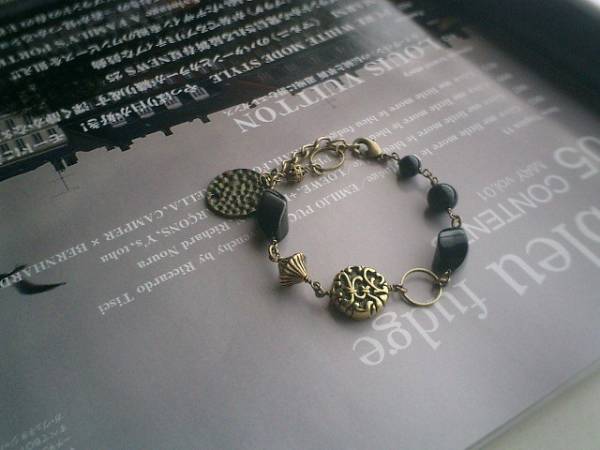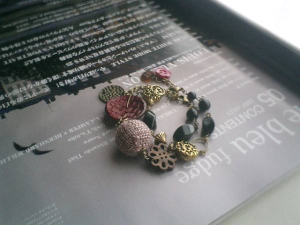大人の黒に魅せられて・・シリーズです♪シックな黒の石を集めたシリーズです♪キュートな異素材を集めたブレスレット2本セットです♪♪シックな黒のブレスレットは6ミリ、8ミリの丸玉、12×8ミリ、17×8ミリのツイストオーバルのオニキスにデザイン違いのメタルビーズを合わせてさりげなく華やかです♪長さは全長23センチ位で調節自由です♪異素材のブレスレットは同じ8ミリの丸玉、17×8ミリのツイストオーバルのオニキスに14ミリから28ミリ位までのウッドや編みボールやアンティークボタンやデザインメタルなど個性的な素材を合わせました♪シックなお色でまとめて大人ニュアンスのあるブレスレットです♪長さは全長23センチ位で調節自由です♪それぞれ単品でも出品しています♪お揃いのネックレスも出品しています♪シンプルで飽きのこないいつまでも着けられるデザインを考えて作りました!ハンドメイドをご理解頂いてノークレーム、ノーリターンでお願いします