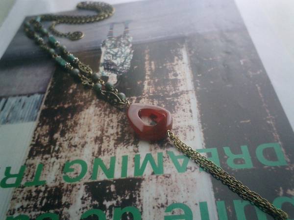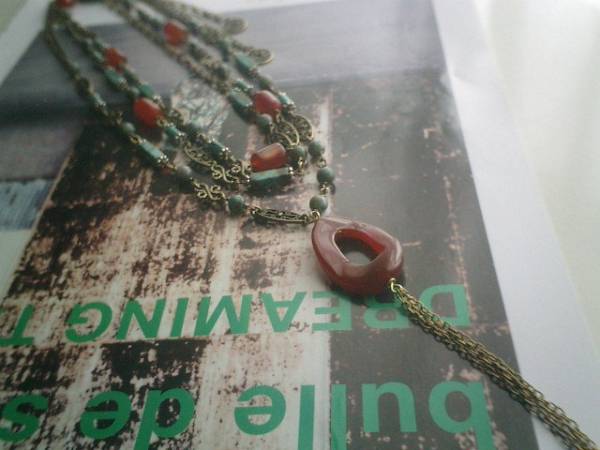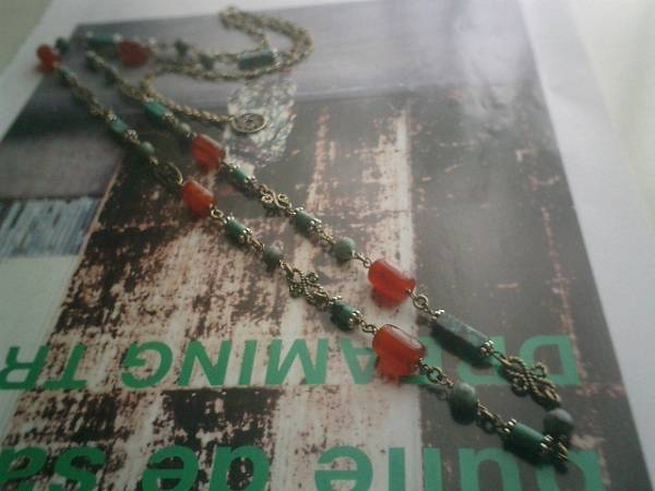 巴里の香り・・シリーズです♪エスニック気分・・シックなカーネリアンとターコイズのネックレス2本セットです♪同じ素材のデザイン違いです♪ターコイズは4×6ミリのチューブや4×15ミリのキューブや6ミリの丸玉など個性的なデザインを集めました♪深いオレンジブラウンのカーネリアンは8×10ミリ位のチューブです♪オリエンタルなデザインメタルを合わせて大人のロマンチックしています♪長さはトップの着いていない方が全長105センチ位で調節自由です♪2連にされても可愛いです♪30×22ミリ位のリングのカーネリアンのトップのネックレスは60センチ+アジャスター15センチで最長75センチ位です♪トップはチェーンを入れて11センチ位です♪それぞれ単品でも出品しています♪お揃いのブレスレットやピアスも出品しています♪シンプルで飽きのこないいつまでも着けられるデザインを考えて作りました!ハンドメイドをご理解頂いてノークレーム、ノーリターンでお願いします