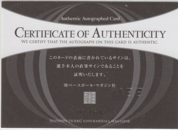 パックから出る直筆サインカードで、シリアルナンバーが入っています。シリアルナンバーは01/60のファーストナンバーです。