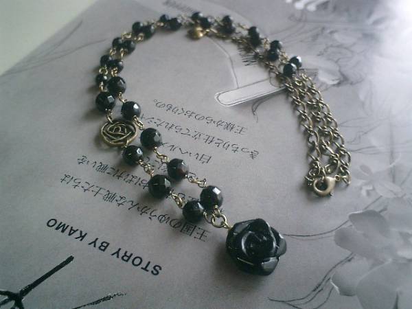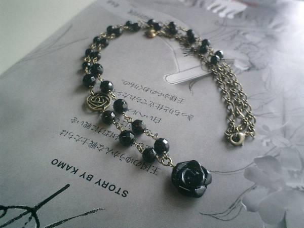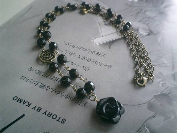ロゼッタのお気に入り・・シリーズです♪小さな黒い薔薇・・シックなオニキスのネックレスです♪6ミリ、8ミリのランダムカットのオニキスにトップは16ミリ位のオニキスの薔薇です♪薔薇のメタルチャームを合わせて可憐な表情です♪長さは全長75センチ位で調節自由です♪お揃いのブレスレットも出品しています♪♪シンプルで飽きのこないいつまでも着けられるデザインを考えて作りました!ハンドメイドをご理解頂いてノークレーム、ノーリターンでお願いします