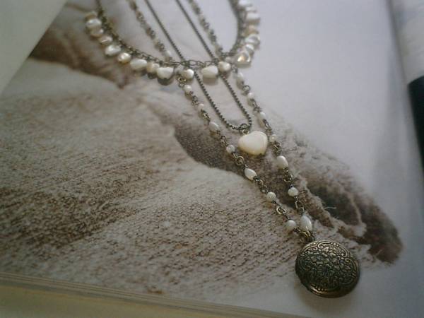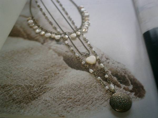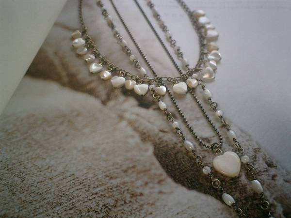 薔薇の香りの女の子・・シリーズです♪オフホワイトのマザーオブパールのネックレス3点セットです♪3本、2本、単品でと色々に楽しんでいただけます♪7ミリ、9ミリの大きさ違いのハートのマザーオブパールはランダムに繋いでキュートな表情です♪長さは全長57センチ位で調節自由です♪チョーカー風にされてもブレスにされても可愛いです♪14ミリ位のハートのマザーオブパールは華奢なボールチェーンを合わせました♪長さは70センチ+アジャスター12センチで最長82センチ位です♪4ミリの丸玉と5×3ミリのライスのマザーオブパールはトップに20ミリ位の薔薇の模様のロケットチャームを合わせてアンティークモダンしています♪長さは全長92センチ位で調節自由です♪それぞれ単品やお揃いのブレスレットやイヤリングも出品しています♪♪シンプルで長く着けていただけるデザインを考えて作りました♪ハンドメイドをご理解頂いてノークレーム、ノーリターンでお願いします