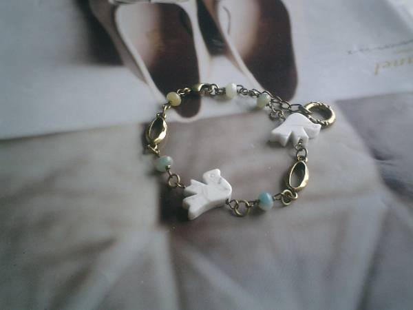 ロゼッタのお気に入り・・シリーズです♪白い小鳥さん・・初夏をイメージして水色のアマゾナイトとハウライトの白い小鳥さんの可憐なブレスレットです♪アマゾナイトは6×4ミリ位のボタンカット、ハウライトの小鳥さんは20×15ミリ位です♪デザインリングを合わせてニューヨークモダンしています♪長さは23センチ位で調節自由です♪♪お揃いのネックレスも出品しています♪♪シンプルで飽きのこないいつまでも着けられるデザインを考えて作りました!ハンドメイドをご理解頂いてノークレーム、ノーリターンでお願いします