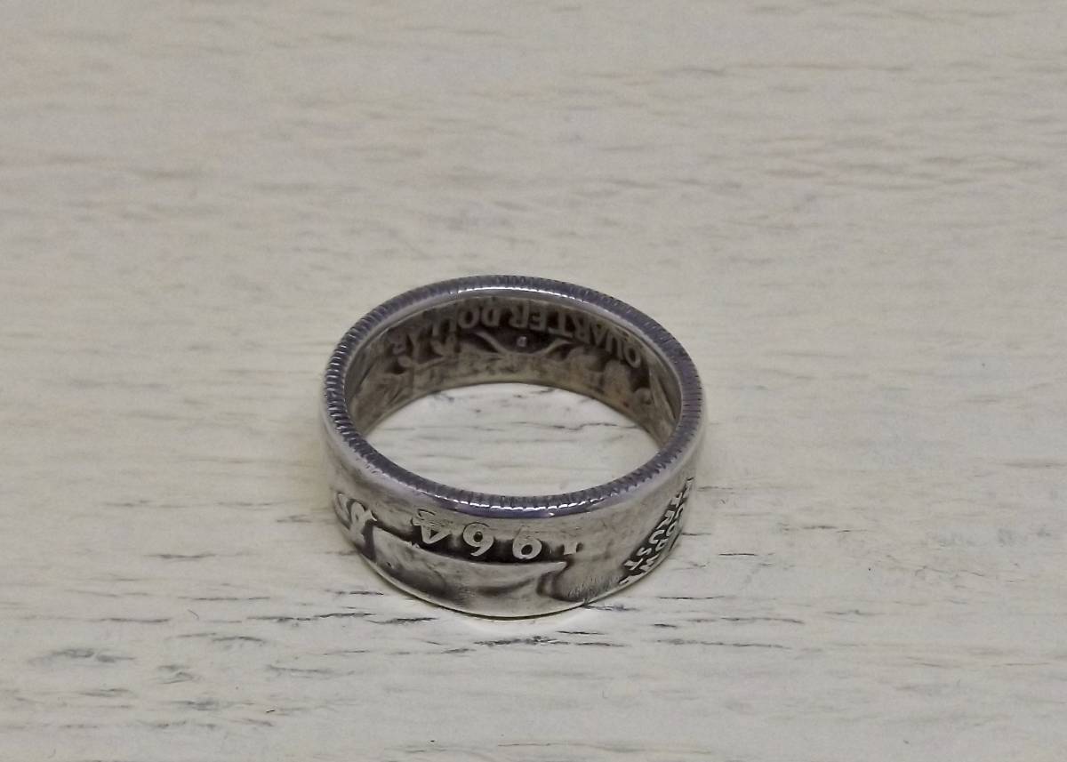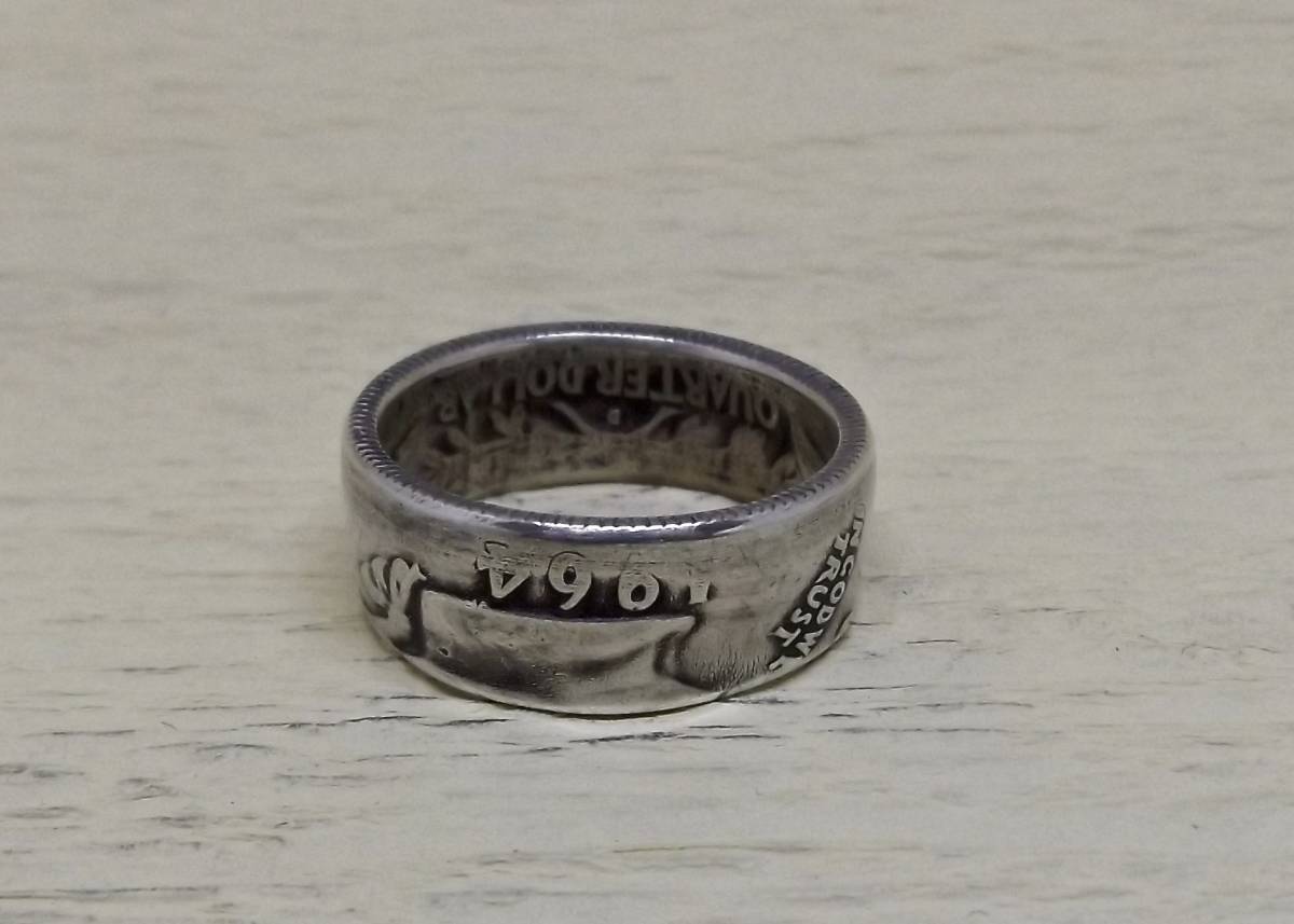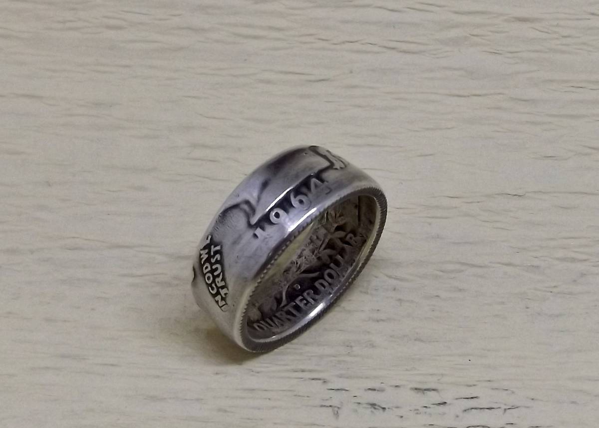 この商品は、1964年の25セント銀貨を使い、ハンドメイドにより作成     銀貨に穴を明け  木槌で叩いてコインリングに成形した1点物です。LIBERTY INCODWE TRUST ワシントンの肖像 UNITED STATES OF AMERICA