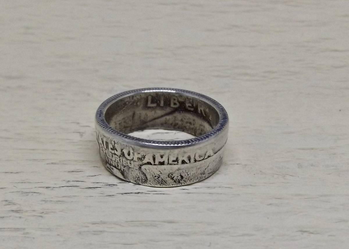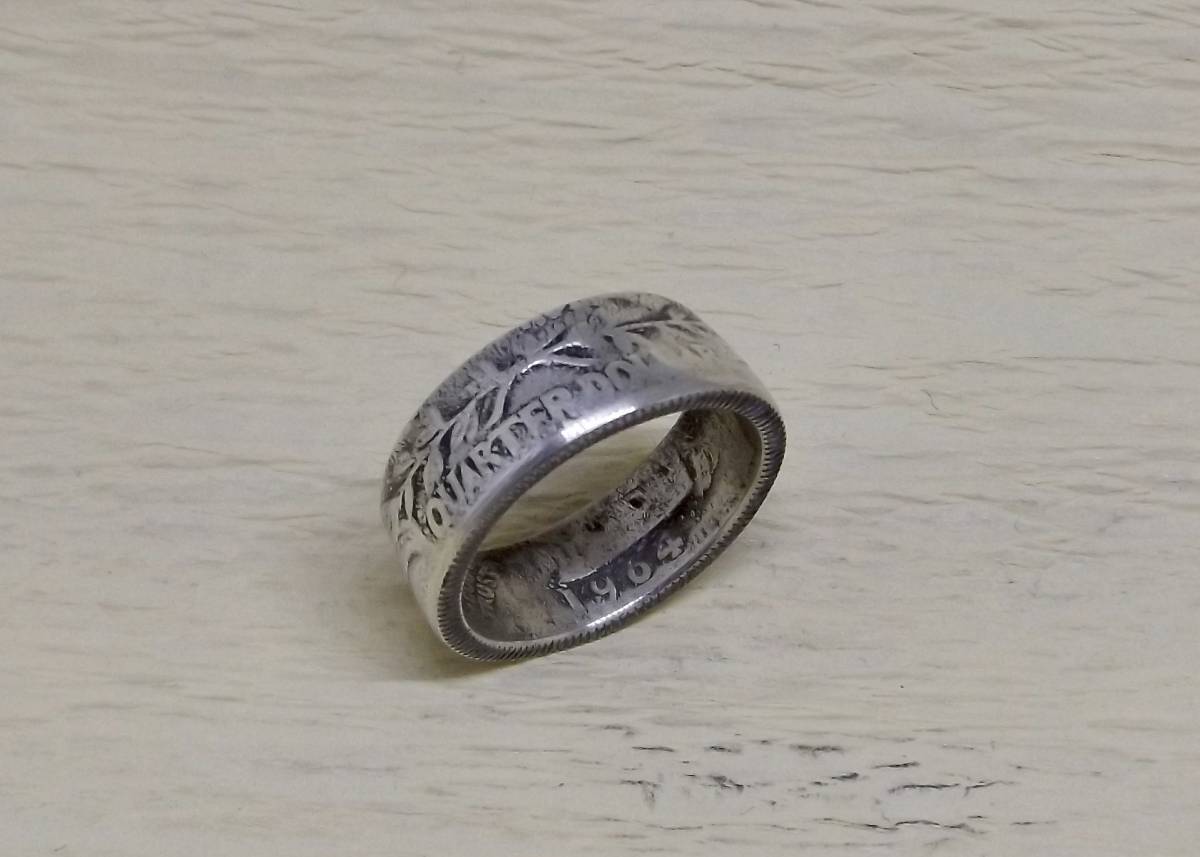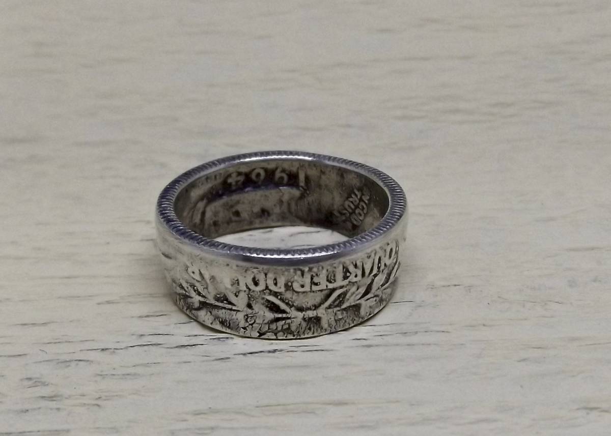 この商品は、1964年の25セント銀貨を使い、ハンドメイドにより作成     銀貨に穴を明け  木槌で叩いてコインリングに成形した1点物です。LIBERTY INCODWE TRUST ワシントンの肖像 UNITED STATES OF AMERICA