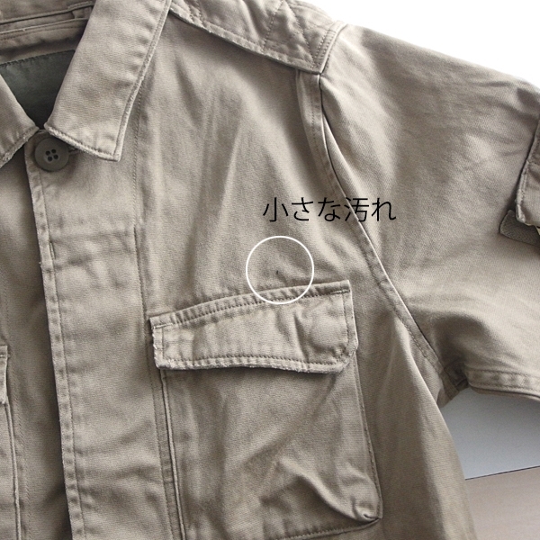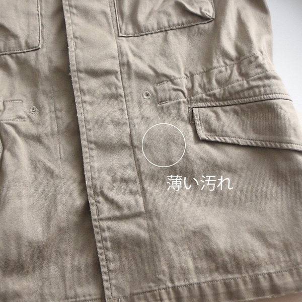・左胸、お腹付近、右下ポケット、右袖口など細かな汚れがいくつか見られます。画像参照