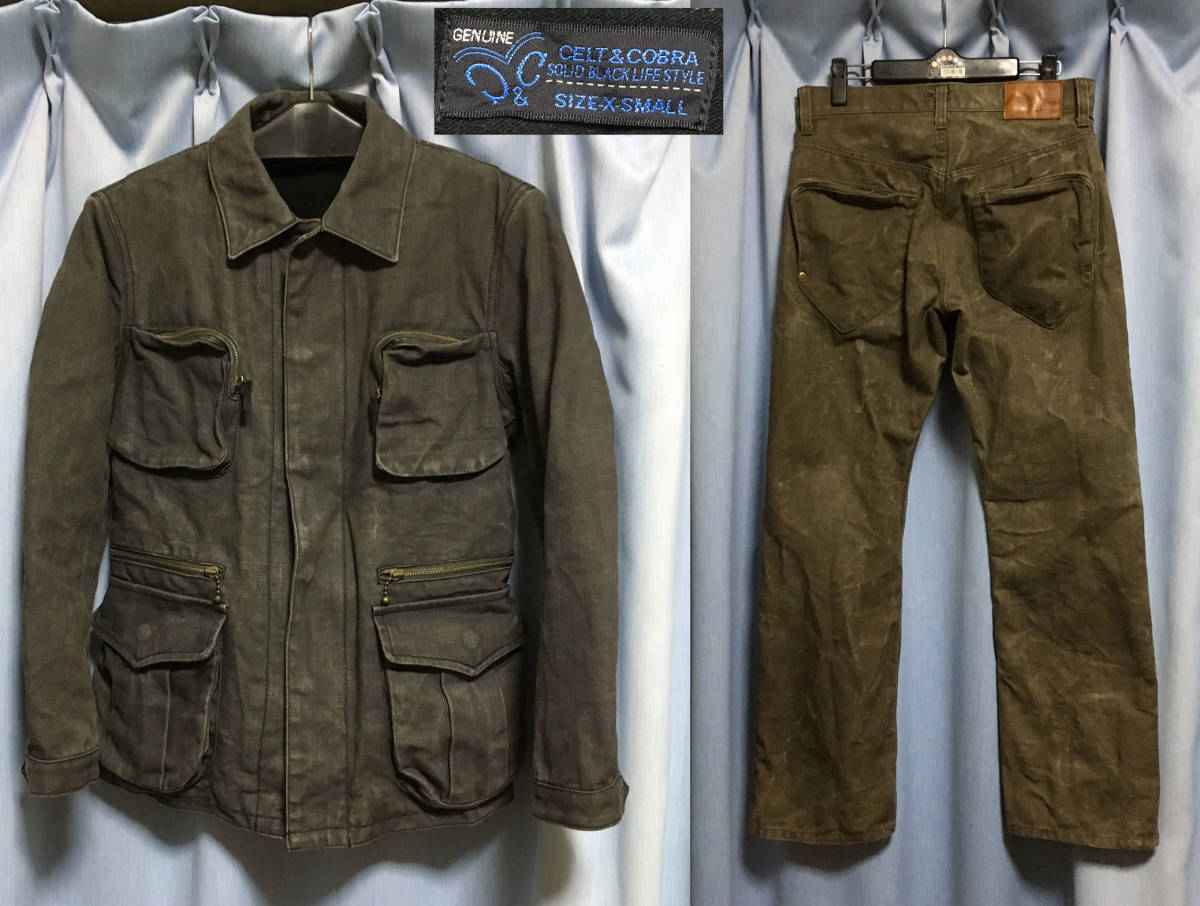 ケルト&コブラのジャケットとパンツです。サイズは上がXS(肩幅44cm 身幅51cm 着丈63cm 袖丈56cm)下が表記不明、多分最小の30インチ(ウエスト76cm レングス74cm 股上25cm 裾幅21cm ワタリ27cm総丈100cm、チェーンステッチ)素人採寸の為多少の誤差はお許し下さい。上下色違いですが、同じような生地なのでセットで出品します。状態はアタリが出ていますがそんなに悪くはないと思います。内ポケットあり。ノークレーム・ノーリターン・ノーキャンセル,送料は別途ご負担お願いします。