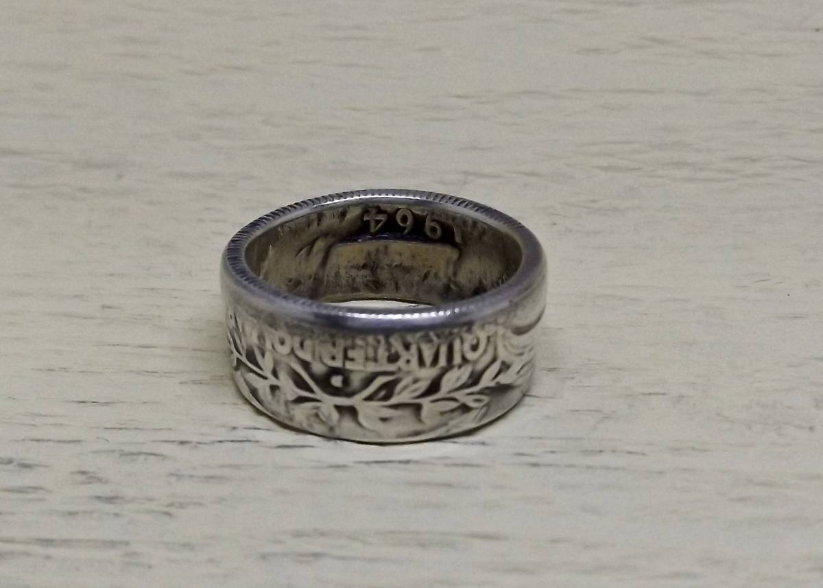 この商品は、1964年の25セント銀貨を使い、ハンドメイドにより作成     銀貨に穴を明け  木槌で叩いてコインリングに成形した1点物です。LIBERTY INCODWE TRUST ワシントンの肖像 UNITED STATES OF AMERICA