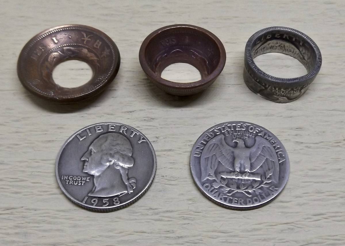 日本の現行貨幣は手を加えることが法律で禁止されていますが、アメリカのお金を加工するのは個人の自由!さすが自由の国アメリカ!? 19321964発行(銀90% 10% アメリカ初代大統領のジョージ・ワシントンの肖像とアメリカの象徴である鷲が刻まれたコインです。指先にクールなかっこよさをイメージさせる、スタイリッシュなシルエットが魅力のアクセサリー。存在感抜群のデザインは、カジュアルファッションのアクセントとして幅広く活躍してくれます。